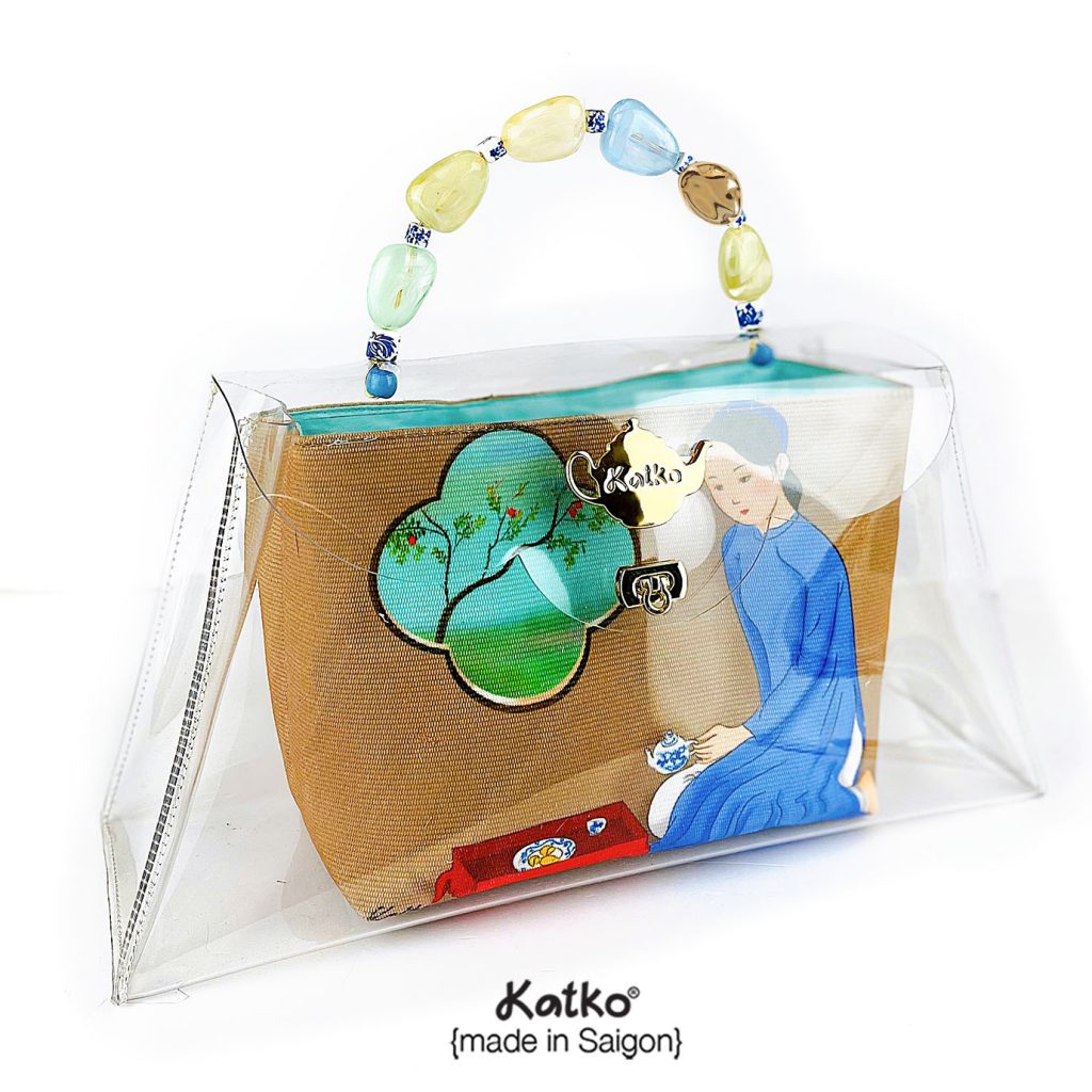 Quai bằng chất liệu sơn mài truyền thống, thân giỏ bằng chất jelly trong suốt sáng bóng. Ruột giỏ được lấy cảm hứng từ những khu chợ truyền thống: cá chép, hình gà trống, hình rau củ quả hay hoa tươi – những hình ảnh gắn liền với hoạt động sinh hoạt hàng ngày, mang vẻ đẹp bình dị rất Việt Nam.