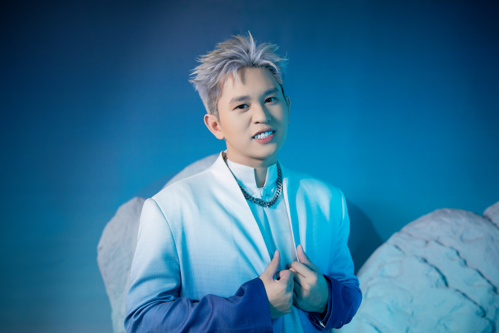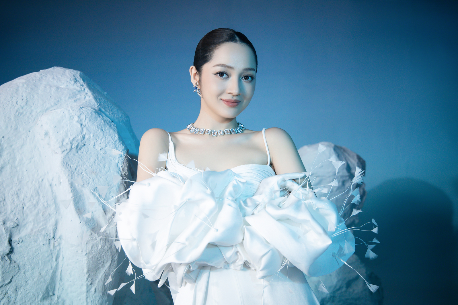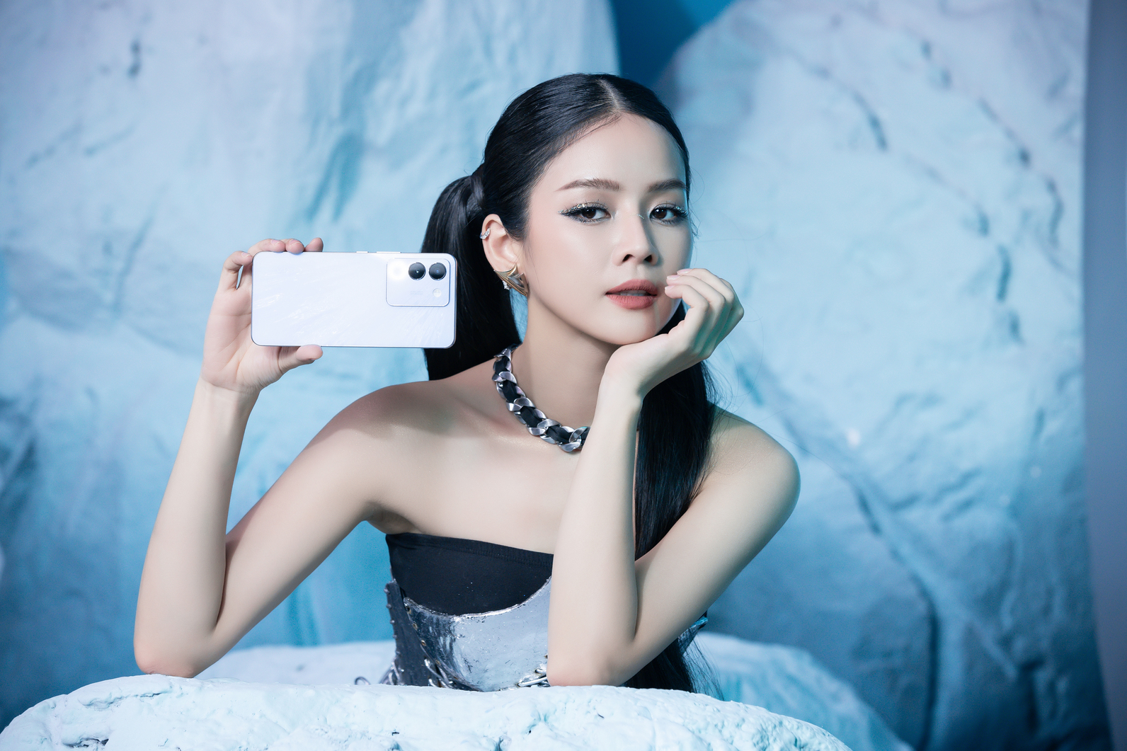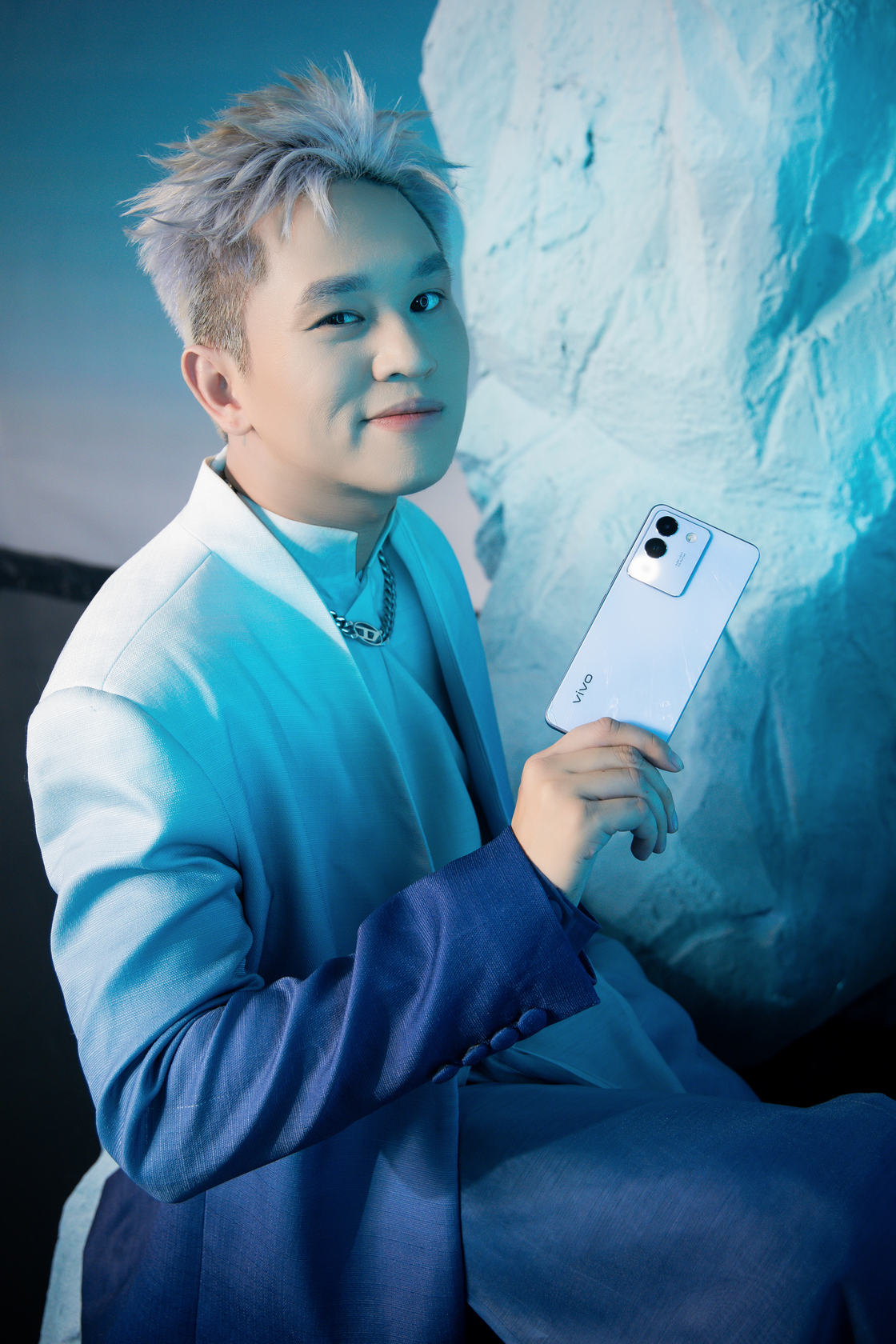 Phần đầu của bộ ảnh chân dung “Tỏa sáng hào quang” được các nghệ sĩ thực hiện dựa trên cảm hứng về tông màu Xanh Sông Băng hào nhoáng và Camera Vòng Sáng Aura 2.0 trên vivo V29e. Các khối băng nhân tạo cùng một vòng sáng khổng lồ được lồng ghép khéo léo, tạo nên một viễn cảnh choáng ngợp và đậm chất tương lai cho bộ ảnh.