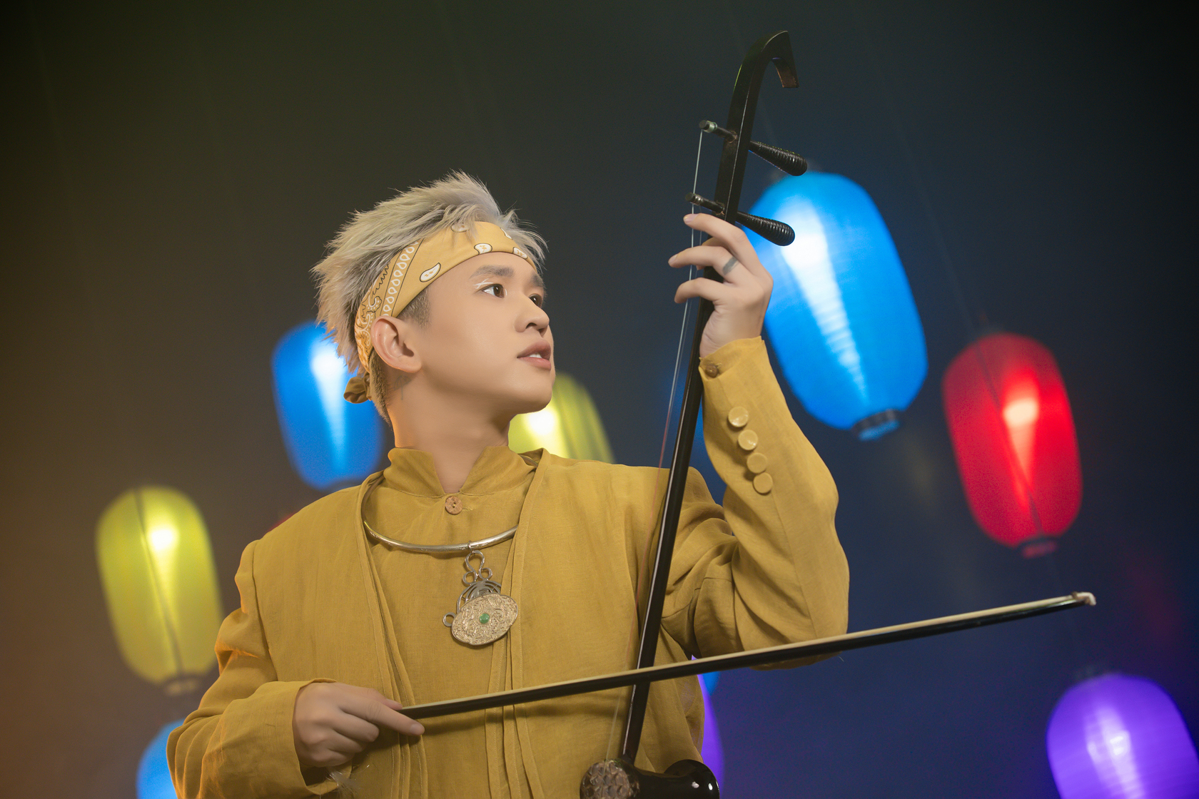 Trên tay những đạo cụ phổ biến của sân khấu dân gian như đàn và quạt, B Ray liên tục di chuyển và thể hiện nhiều tạo dáng độc đáo. Ống kính chống rung OIS vốn chỉ xuất hiện trên các dòng điện thoại cao cấp của vivo V29 series, đặc biệt là khả năng bù sáng thông minh, thay đổi nhiệt độ màu chủ động của Vòng Sáng Aura 2.0 đã tạo ra những bức ảnh chuẩn chỉnh đến từng chi tiết nhỏ.