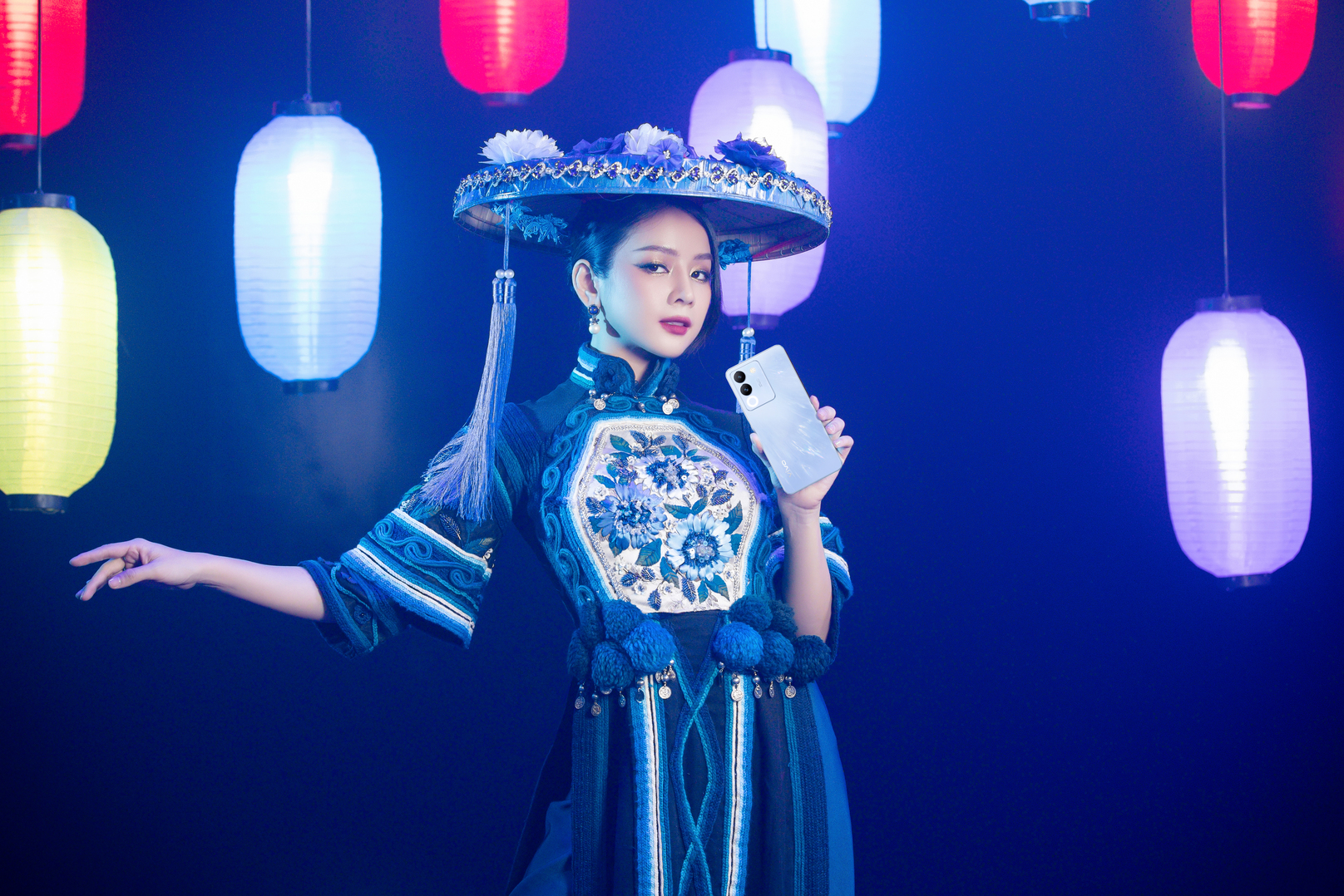 Khoác trên mình chiếc nón quai thao cách điệu, Mie trở nên vô cùng đằm thắm nhưng cũng không kém phần sắc sảo. Với khả năng phủ sáng đồng đều 3600, độ sáng tăng lên đến 60% so với thế hệ trước và diện tích vùng chiếu sáng tăng gấp 6.8 lần so với đèn flash thông thường, Vòng Sáng Aura 2.0 trên vivo V29e đã khiến khung cảnh đêm với vô vàn đèn lồng sau lưng Mie bừng sáng lung linh. Không chỉ gương mặt mà họa tiết thêu tay tỉ mỉ trên áo và từng đóa hoa trên nón quai thao cũng hiện lên vô cùng rõ ràng, không hề gặp phải tình trạng cháy sáng hay lóa như đèn flash.