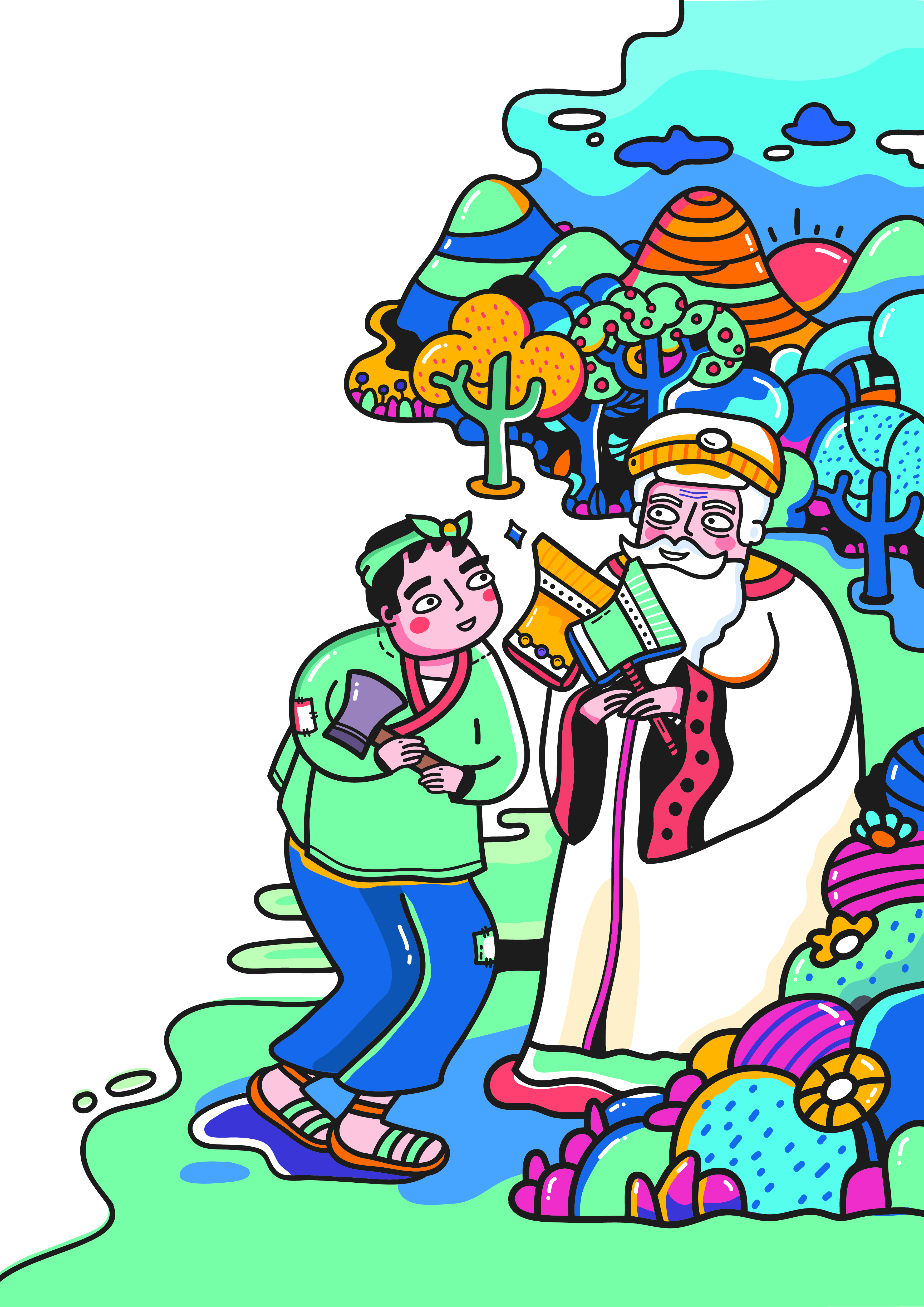 Bỗng từ đâu đó có một ông cụ tóc trắng bạc phơ, râu dài, đôi mắt rất hiền từ xuất hiện trước mặt chàng, ông cụ nhìn chàng tiều phu và hỏi: