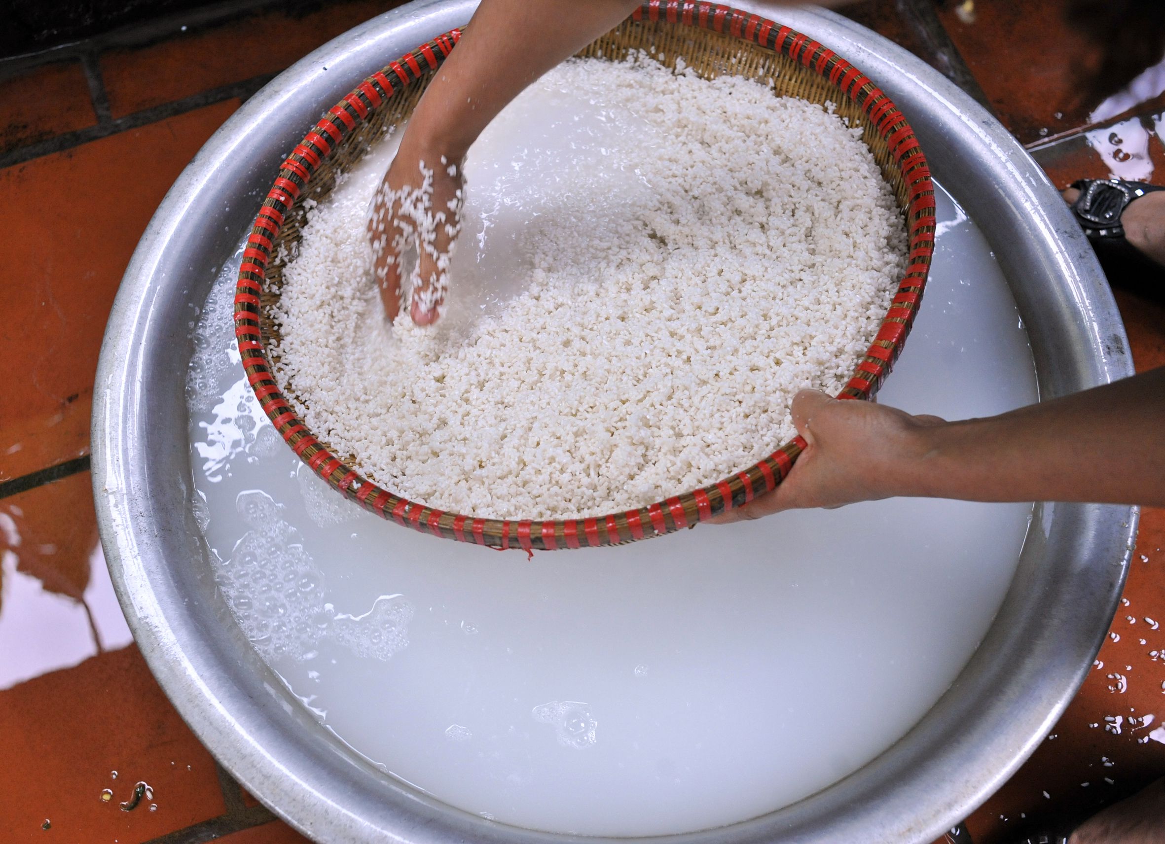 Để làm được một chiếc bánh giầy, những người thợ làng Quán Gánh phải qua gần 20 công đoạn với sự khéo léo để tạo ra chiếc bánh có hương vị đặc trưng mà chỉ có người Quán Gánh mới làm được. Đó là vị dẻo thơm của xôi nếp, màu xanh non của lá chuối, độ thơm ngậy của đậu, thịt được pha trộn cùng với những hương liệu khác. Muốn có bánh giầy ngon, người thợ trong làng đã rất chú ý ở khâu chọn gạo, đồ xôi. Gạo làm bánh phải là loại nếp thật trắng, dẻo thơm, thứ gạo nếp cái hoa vàng được dần sàng kỹ lưỡng, hạt đều tăm tắp, không lẫn tẻ cũng không pha trộn với các loại khác. Đậu xanh cũng phải đều hạt, mẩy chắc để khi làm nhân mới bùi, mới thơm. Cả gạo lẫn đỗ đều phải ngâm nước ấm cho mềm hạt, sau đó mang đồ thành xôi. Xôi đồ vừa khéo, đủ độ để giã thành vỏ bánh dẻo thơm.
