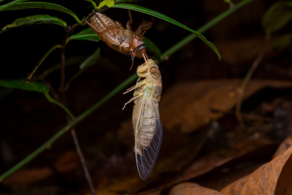 Khu rừng tắt nắng cũng là lúc bắt đầu của nhịp râm ran vang lên khắp các ngóc ngách. Tôi dùng vội bữa tối trước sự thôi thúc từ tiếng gọi của côn trùng, các loài lưỡng cư. Men theo con đường mòn ra suối, không khó để bắt gặp đám côn trùng với đủ dạng hình thù, màu sắc. Đám dế mèn, châu chấu, muồm muỗm gọi bạn tình bằng tiếng kêu phát ra từ cái đập cánh nhanh cọ xát vào nhau. Ve sầu chui lên từ lòng đất, vội vàng lột bỏ lớp vỏ bọc màu nâu xỉn để hoá mình thành những nhạc công chăm chỉ của khu rừng.