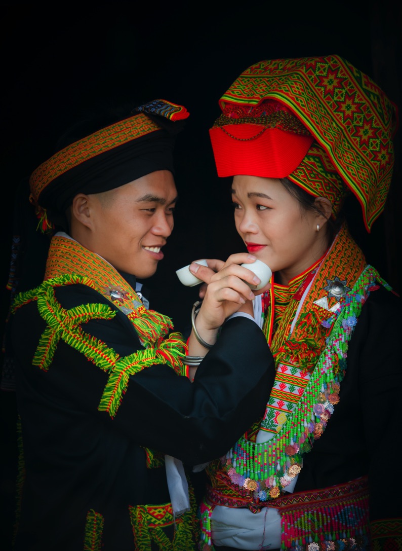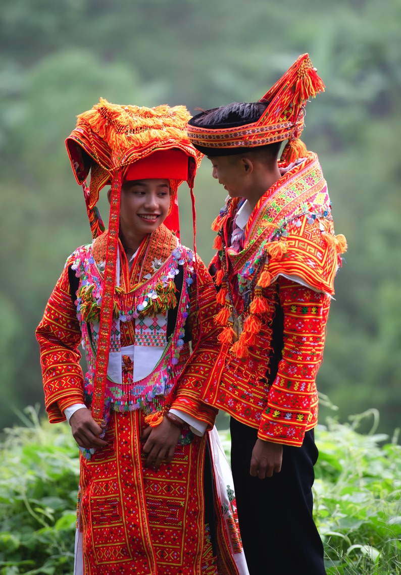 Nếp mặc của người Dao ở Mẫu Sơn còn được thể hiện độc đáo hơn ở trang phục cưới. Vào ngày cưới, người người diện những bộ áo quần mới đẹp nhất để dự lễ. Cô dâu, chú rể được hai họ chăm chút ăn mặc hơn cả. Chú rể thường mặc áo dài màu trầm phủ ngoài quần dài, vai khoác và buộc tấm khăn to kèm thêm dải khăn dài thêu thổ cẩm màu vàng đỏ. Trên đầu đội mũ cùng khăn che mặt màu tối. Phía cô dâu thì áo váy cầu kỳ hơn nhiều. Ngoài của hồi môn, cô dâu phải có hai bộ trang phục để về nhà chồng. Một bộ lúc rời nhà bố mẹ đẻ và một bộ thay trước khi bước vào nhà trai. Trang phục của cô dâu gồm khăn che mặt, áo dài nhiều lớp cùng quần và 4 chiếc thắt lưng. Mỗi bộ trang phục của cô dâu người Dao trung bình có từ 3 đến 10 lớp. Gia đình nào sung túc thì trang phục cô dâu sẽ được may nhiều lớp hơn. Nhà trai háo hức đón dâu từ tinh mơ, còn cô dâu hồi hộp chuẩn bị sẵn sàng mọi tư trang, đồ đạc để lên đường. Trước khi vào cổng nhà trai, đoàn nhà gái sẽ dừng lại để các phù dâu phụ giúp thay đồ mới cho cô dâu. Lúc này, cô dâu đeo thêm vòng cổ, vòng tay, trang sức bằng bạc. Trên tay cô dâu chú rể đều ngay ngắn một tấm vải trắng thêu họa tiết đơn giản để làm lễ bái đường.