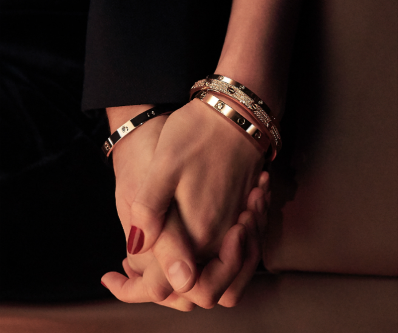 Love de Cartier là thiết kế kim hoàn danh tiếng bậc nhất của thương hiệu Pháp kể từ khi ra mắt vào năm 1969, qua năm tháng, nó vẫn được lưu truyền như một biểu tượng tình yêu vĩnh cửu. Về cấu tạo, lối gắn kết từ hai nửa hình bán nguyệt ghép vào nhau. Chúng thể hiện sự hòa hợp của hai tâm hồn đồng điệu. Điểm độc đáo là những viên ốc vít trang trí xung quanh vòng chỉ có thể được tháo rời bằng tuốc nơ vít bằng vàng đi kèm; với ý niệm về một tình yêu mãi mãi không chia lìa. Bên cạnh phiên bản vàng hồng, bộ sưu tập Love de Cartier còn bao gồm nhẫn được trang trí những viên đá quý sapphire nhiều màu sắc, vàng trắng 18K hay vàng hồng đính kim cương và đá ceramic đen. Vẻ đẹp, sự tinh tế và sáng tạo trong thiết kế biểu đạt sức mạnh và sự trường tồn của tình yêu.