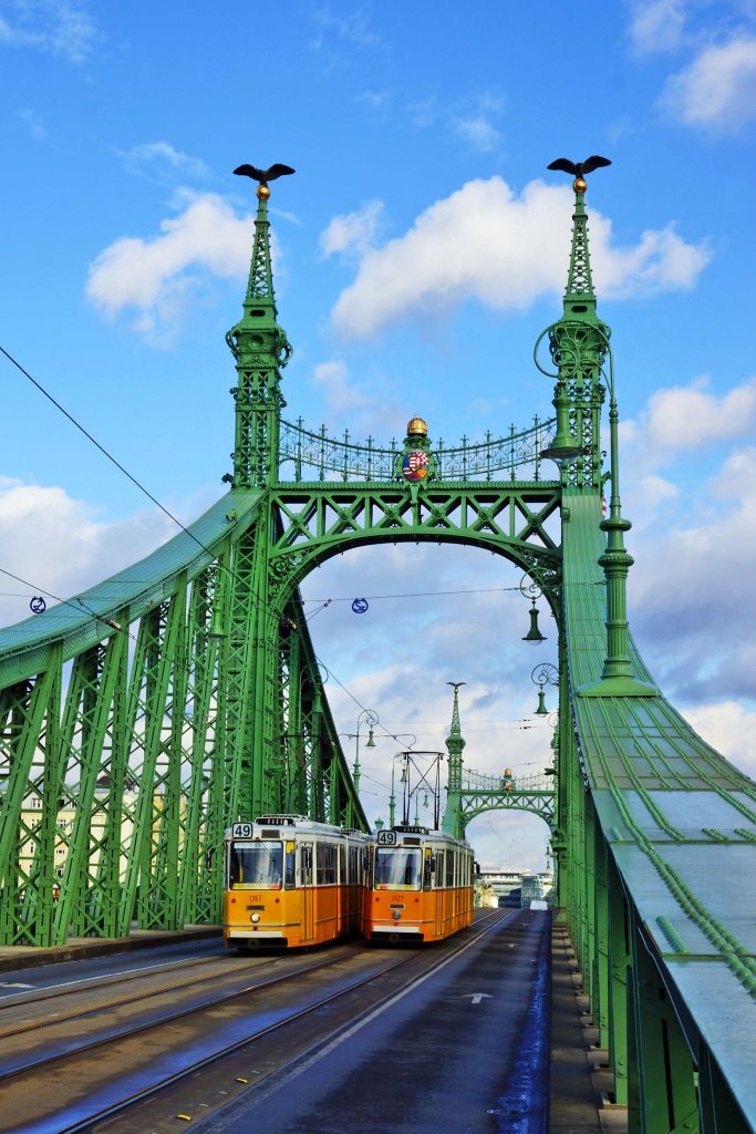 Mỗi cây cầu ở Budapest đều mang một vẻ đẹp riêng và cuốn hút du khách ở những điểm khác lạ. Cầu Tự do màu xanh lá có thể coi là cây cầu duyên dáng nhất Budapest. Như một dải lụa bắc qua sông, với lối kiến trúc cổ kính, tinh tế, cầu Tự do luôn được bình chọn vào top các cây cầu đẹp nhất ở Budapest cũng như luôn lọt vào top kiệt tác kiến trúc của thế giới. Ba nhịp cầu có thành cầu cong cong đã làm cho cây cầu trở nên mềm mại, tô điểm thêm sự lãng mạn vốn có của thành phố. Điểm nhấn đáng chiêm ngưỡng nữa là các đỉnh cầu được trang trí bằng quốc huy Hungary và tượng một loài chim ưng thường được nhắc tới trong thần thoại Hungary cổ đại.