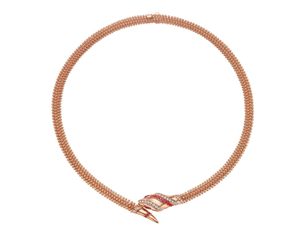 Đặc biệt, phiên bản giới hạn của vòng cổ Serpenti 2025 gây ấn tượng với sự kết hợp giữa vàng hồng, kim cương và ruby, tạo hiệu ứng thị giác rực rỡ. Phần mắt làm bằng đá ruby đỏ rực mang đến sức hút huyền bí, vốn là biểu tượng của dòng Serpenti.