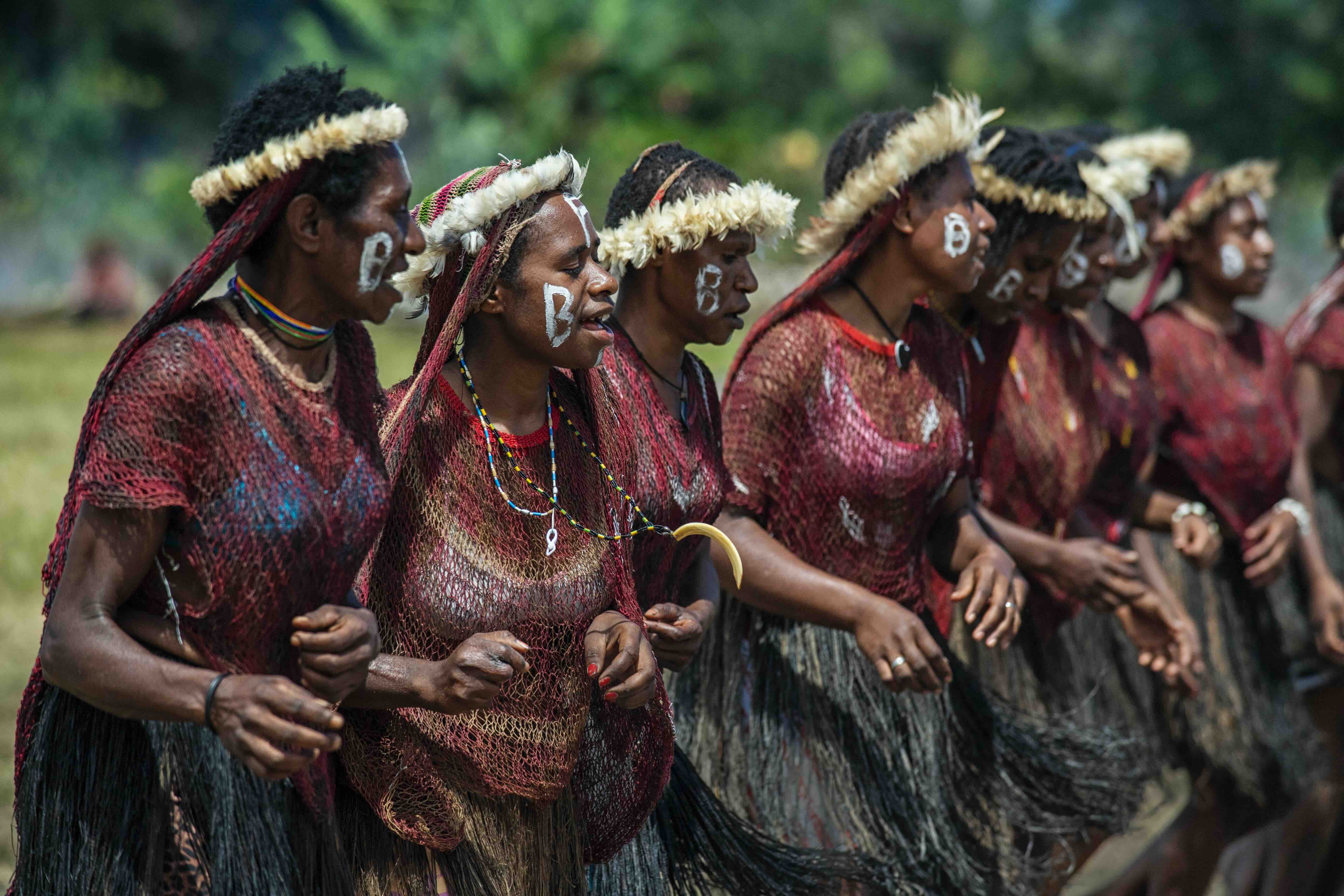 Không quần là áo lượt, không trang điểm lòe loẹt, tất cả đều vận trang phục truyền thống đơn giản như nhau. Phụ nữ đóng váy bện rơm hoặc vỏ cây, để ngực trần còn đàn ông ở trần và chỉ đeo duy nhất một quả bầu khô để che phần nhạy cảm (koteka). Cả nam lẫn nữ đều đeo đồ trang sức làm từ vỏ sò, xương, hạt và lông chim nhiều màu sắc. Riêng các chiến binh thường xỏ mũi bằng nanh lợn rừng với niềm tin rằng điều này sẽ mang lại cho họ sức mạnh tuyệt đối.