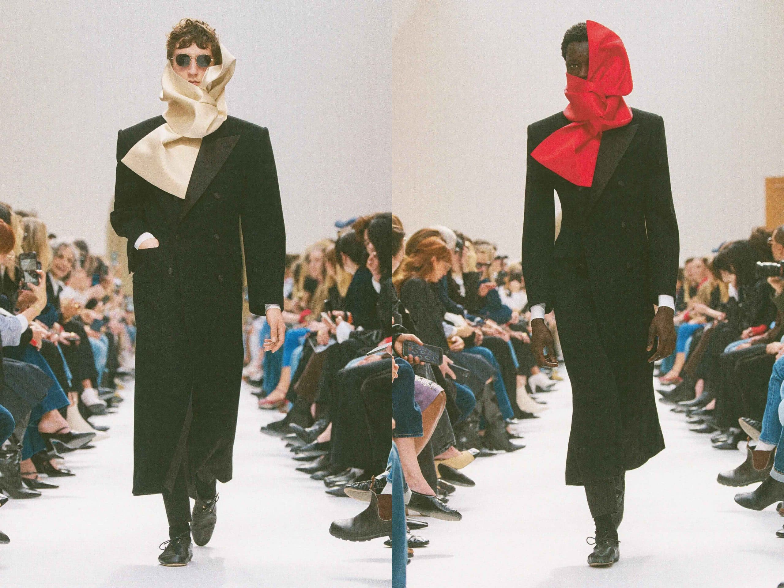 Tinh thần ngẫu hứng này cũng xuất hiện trong nhiều chi tiết nhỏ của bộ sưu tập. Một vài người mẫu nam bước ra với những chùm lông vũ nhỏ cắm trên tóc, tạo nên một vẻ ngoài vừa tinh nghịch vừa hơi siêu thực. Một số thiết kế sử dụng khăn satin quấn cao lên gần mặt, gợi ý về những “inner lives” phức tạp mà Rider cho rằng quần áo không nên cố che giấu. Những đôi giày trắng – lựa chọn khá lạ lẫm cho mùa thu đông – cũng xuất hiện trên sàn diễn, như một cú đảo nhịp nhẹ trong tổng thể bảng màu trầm.