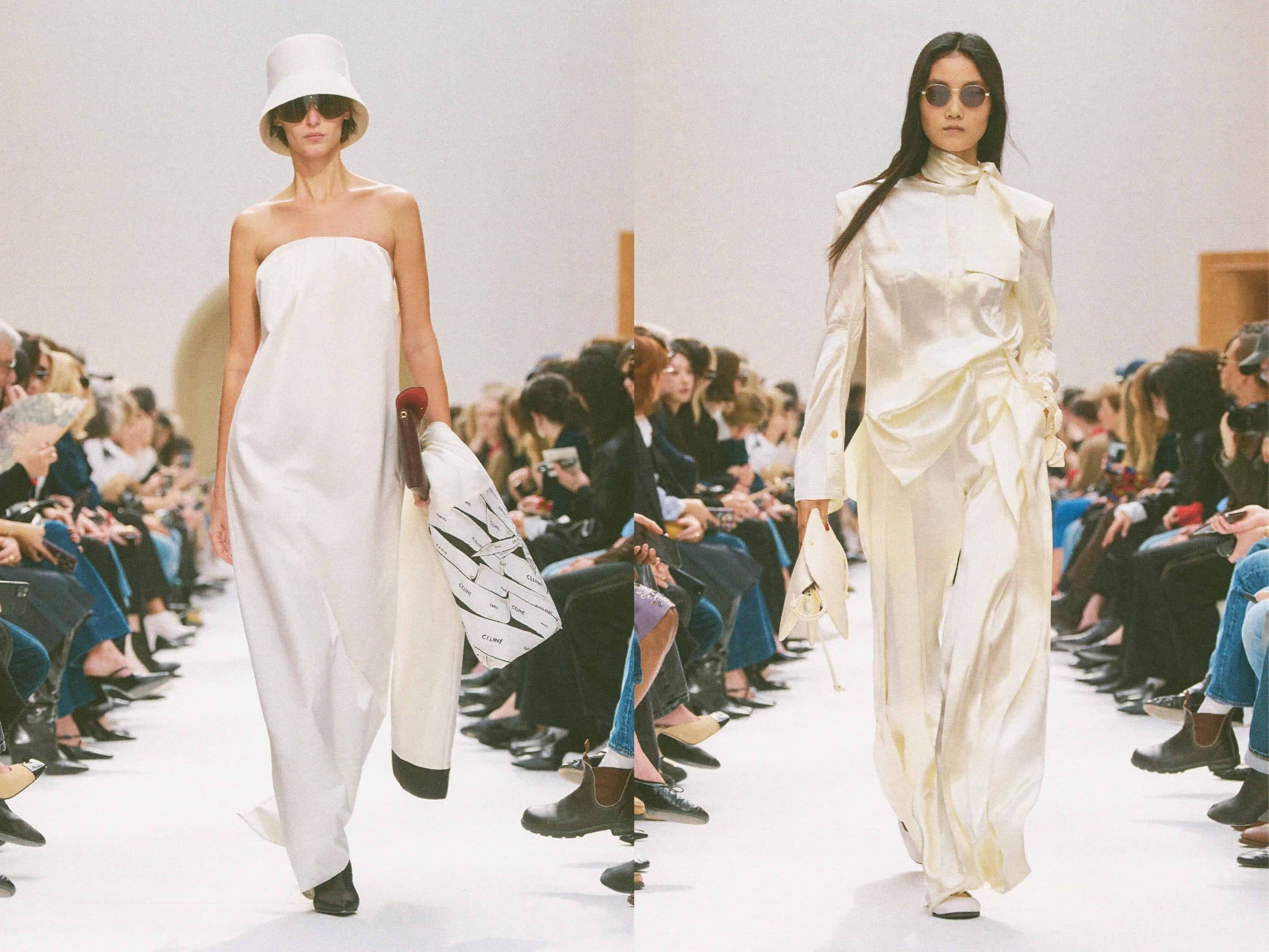 Bộ sưu tập cũng cho thấy khả năng cân bằng giữa sự sang trọng tinh tế và những yếu tố hơi lập dị – điều đã trở thành một phần DNA mới của CELINE dưới thời Rider. Trên sàn diễn, một chiếc váy satin trắng không dây xuất hiện với vẻ tối giản gần như tuyệt đối, rơi mềm theo đường cơ thể. Tuy nhiên, nó được kết hợp với mũ bucket và kính oversized, cùng đôi boots thấp gót, khiến vẻ thanh lịch cổ điển bỗng mang một hơi thở đương đại và dễ tiếp cận hơn. Ở phía nam giới, trench coat màu kem với phom dáng gọn gàng được mặc cùng quần đen ôm và giày da tối giản, gợi nhớ đến tinh thần Paris thập niên 70 – vừa trí thức vừa phóng khoáng.
