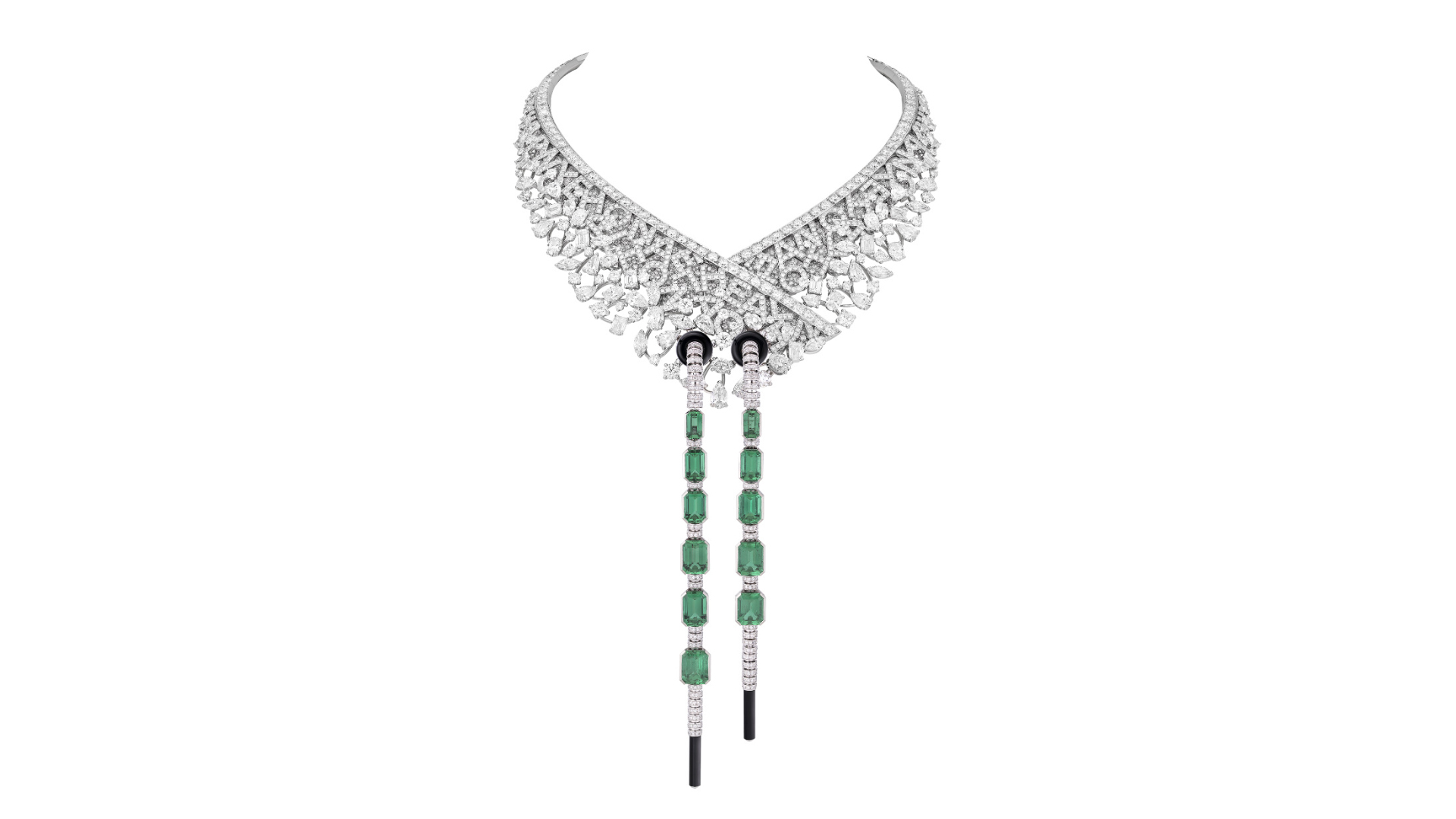 Sweater Prestige Necklace là chiếc vòng cổ tinh xảo được chế tác từ vàng trắng, bạch kim, kim cương, ngọc lục bảo và mã não đen. Trong đó điểm nhấn là 11 viên ngọc lục bảo cắt emerald với tổng trọng lượng 37,18 carat. Lấy cảm hứng từ tinh thần thể thao thanh lịch và chi tiết dây rút đặc trưng của những chiếc áo sweatshirt cổ điển, Sweater Prestige Necklace mang đến hình ảnh đối thoại độc đáo giữa thời trang thể thao và nghệ thuật trang sức cao cấp, qua đó tái hiện tinh thần sáng tạo tự do của người sáng lập Gabrielle Chanel.