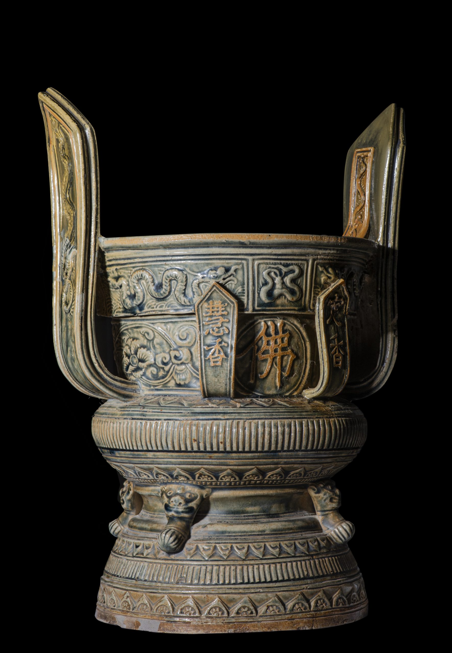 Bên ngoài 2 dải quai lớn có hình rồng nổi, uốn khúc. Có 4 dải quai nhỏ bên thân, mỗi dải có hình chữ Hán nổi là: “Định Hương”, “Huệ Hương” (còn gọi là Tuệ Hương), “Giải thoát hương” và “Giải Thoát Tri Kiến Hương”. Đó là các chữ trong bài Nguyện Hương của Phật giáo với ý nghĩa nguyện cho khói nhang mà người đốt lên để cúng Phật sẽ kết thành những đám mây hương rộng lớn bay khắp 10 phương, đến các nơi có Phật tử. Nghĩa của chữ “Hương” ở đây là mùi hương của phẩm hạnh. Trong đó, “Định Hương” mang nghĩa là tâm thế người đốt hương đã định, thanh tịnh. “Huệ Hương” là mong cho trí tuệ của người đốt hương luôn luôn thông tuệ, thấy rõ được cảnh đời là vô thường. “Giải thoát hương” là giải thoát ra khỏi sự sinh tử, luân hồi. “Giải thoát Tri Kiến Hương” là thấy và biết được các pháp, thâm nhập vào trong cảnh giới của Phật…