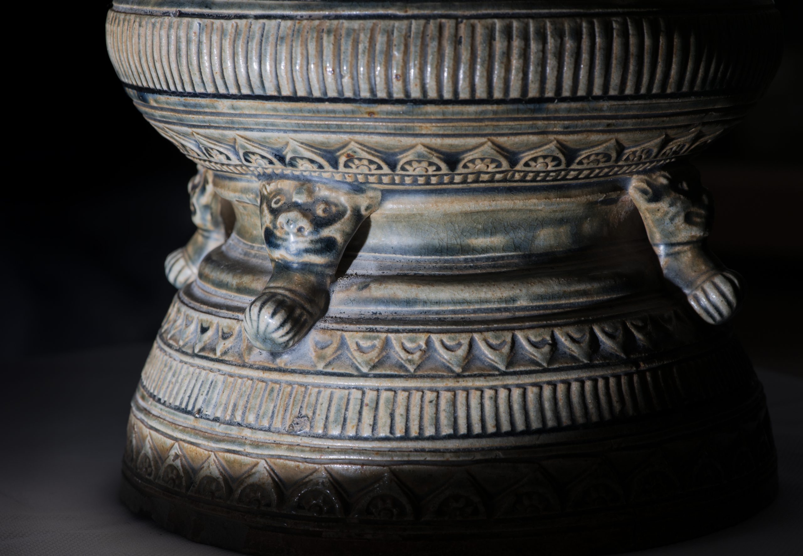 Phần đế của lư hương có dáng trống đồng Đông Sơn với phần tang phình, trang trí các vành hoa văn có yếu tố của cả loại trống đồng Mường như hoa văn cánh sen, hoa văn tam giác…