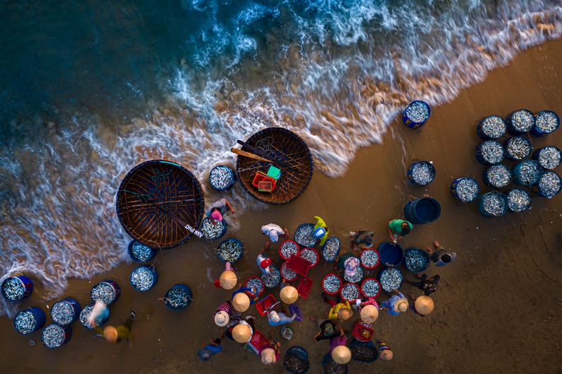 Tôi khởi động thiết bị flycam, với góc nhìn từ trên cao, toàn cảnh khu chợ là một bức tranh nhộn nhịp. Người người đi chợ, xung quanh là đủ loại thúng mủng, thau chậu, quang gánh. Những người phụ nữ lái buôn chạy qua chạy lại như con thoi để dò hàng. Khi ánh sáng mặt trời vừa lên cũng là lúc không khí trở rộn ràng. Những người đàn ông hối hả mái chèo đưa những đợt cá vào bờ, bàn chân đạp lên mạn thuyền thúng tròng trành theo cơn sóng. Một cảnh tượng huy hoàng, kỳ thú hiện lên trước mắt tôi, mặt trời khổng lồ đỏ rực như hòn lửa dần nhô lên mặt biển. Từ khơi xa, những đoàn tàu đánh cá lần lượt tiến vào bờ mỗi lúc một đông. Kèm theo đó là vô số thúng hải sản còn tươi rói được khiêng vào chợ. Không chỉ lái buôn, những người phụ nữ gánh thuê, những ngư dân liên tục đổ hàng, chia hàng và mặc cả. Lòng tôi như rộn vui và không khỏi háo hức theo nhịp sống nơi đây.
