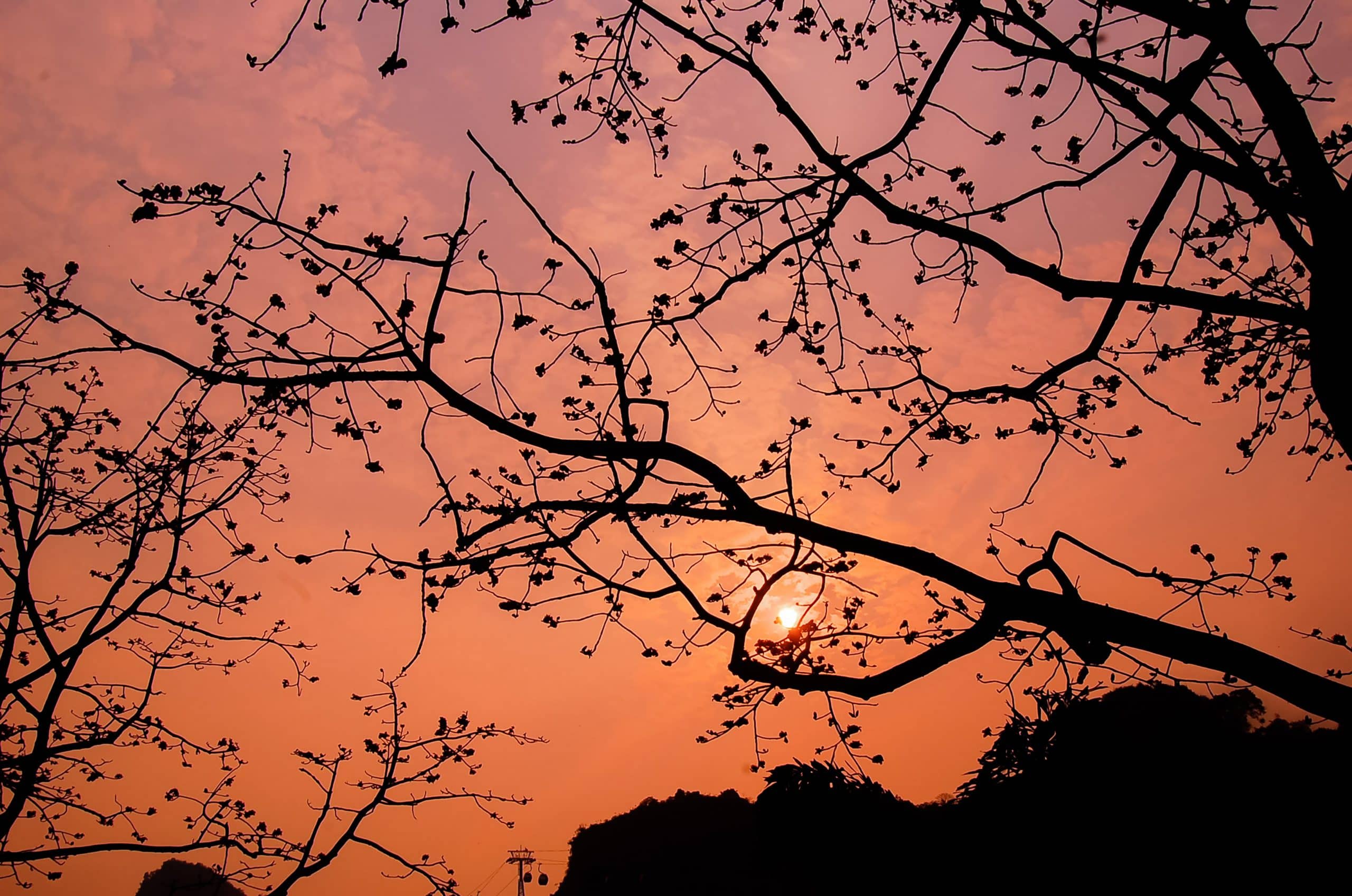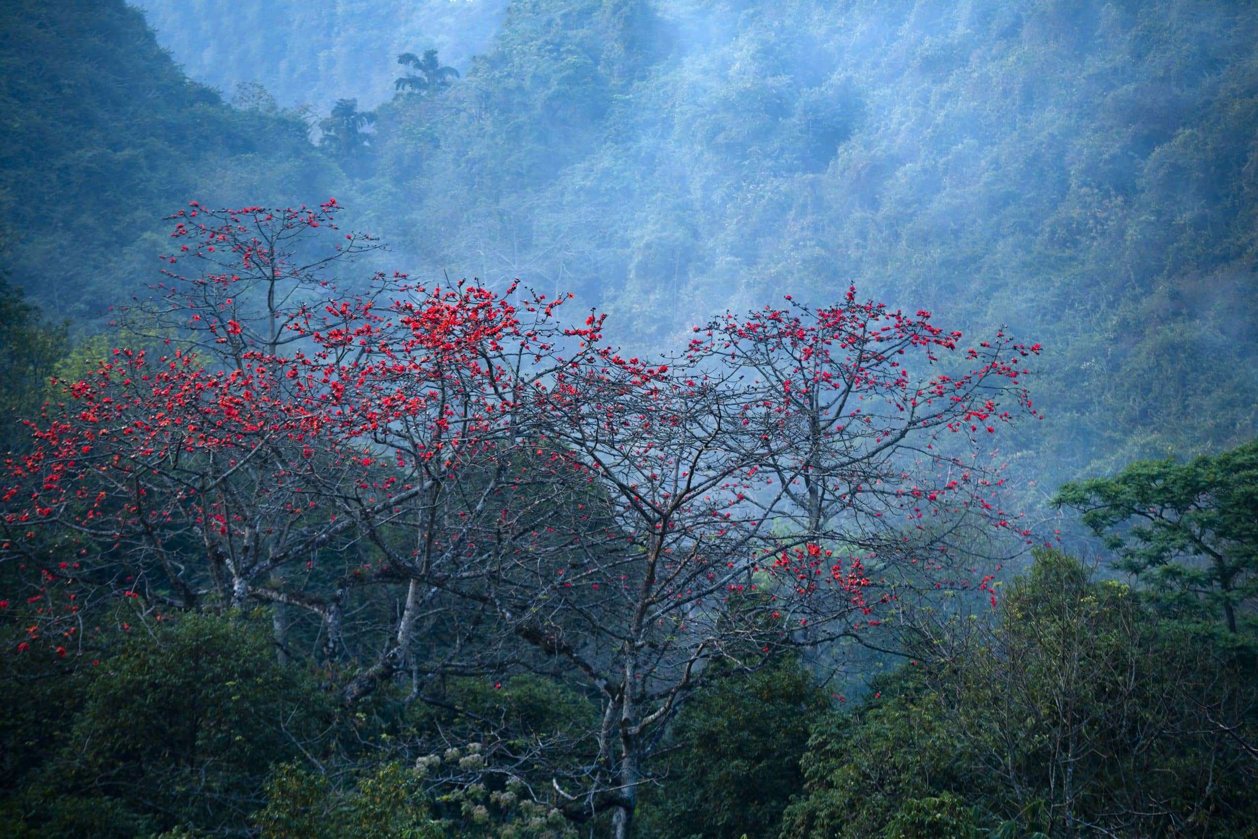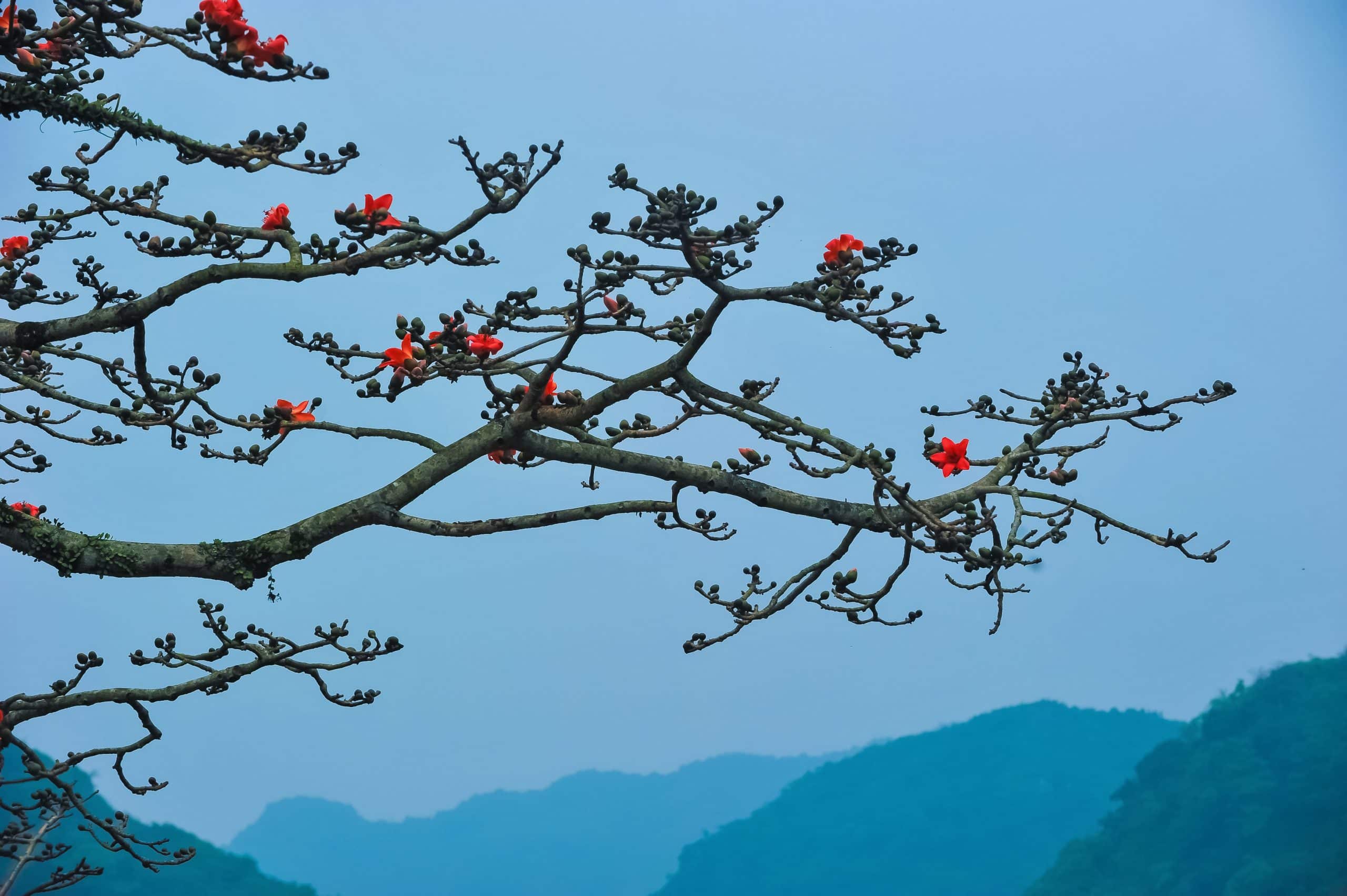 Mùa hoa gạo ở chùa Hương thường nở rộ từ giữa tháng 3 đến đầu tháng 4 dương, kéo dài khoảng 2 – 3 tuần tùy thời tiết. Có những ngày trời hửng nắng, màu đỏ trên tán cây như được “thắp” lên, rực mà không gắt. Cũng có những buổi sớm, sương còn mỏng, hoa gạo nhìn xa như những đốm lửa hiền treo giữa nền núi xanh, khiến cả khung cảnh trở nên mềm mại hơn.