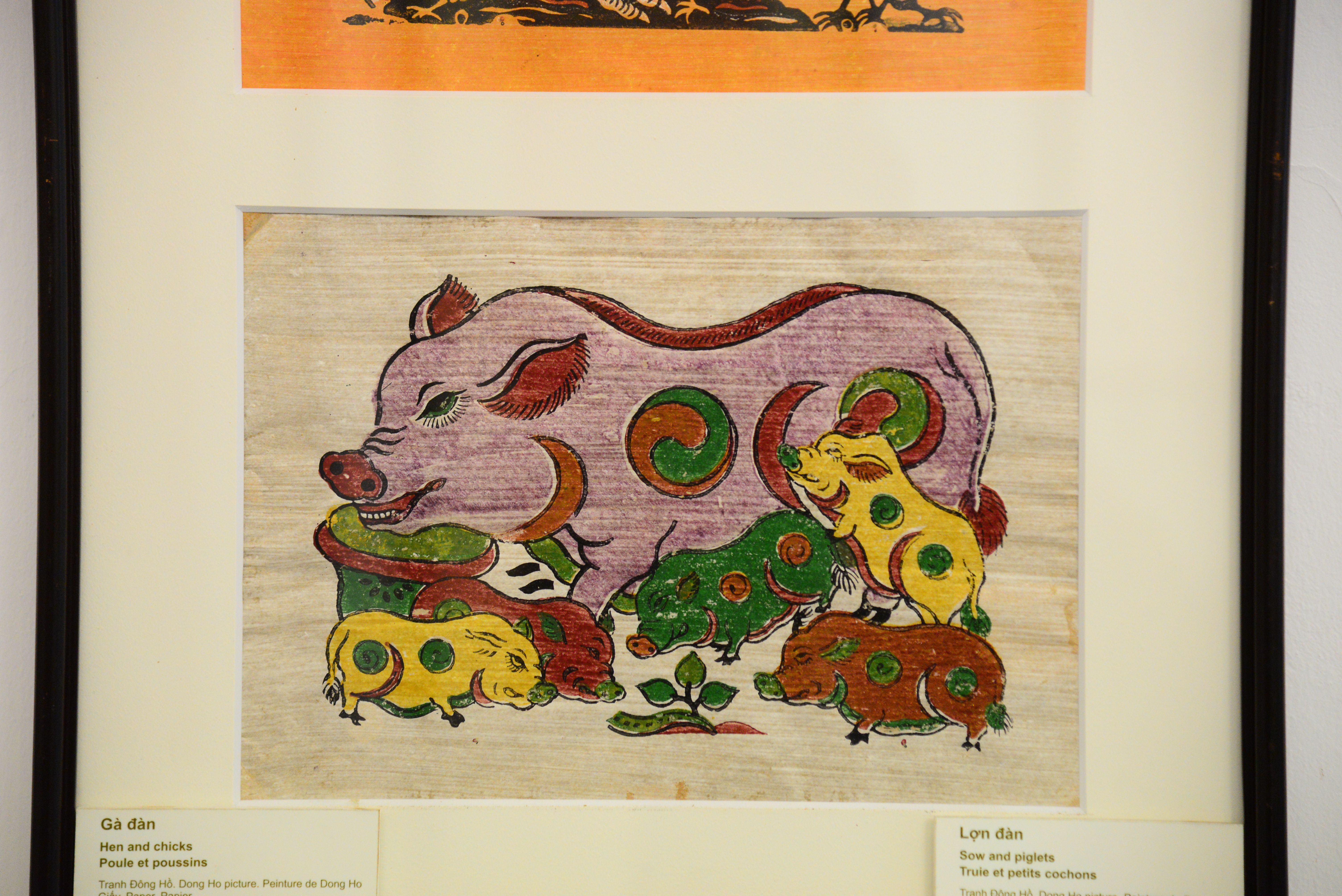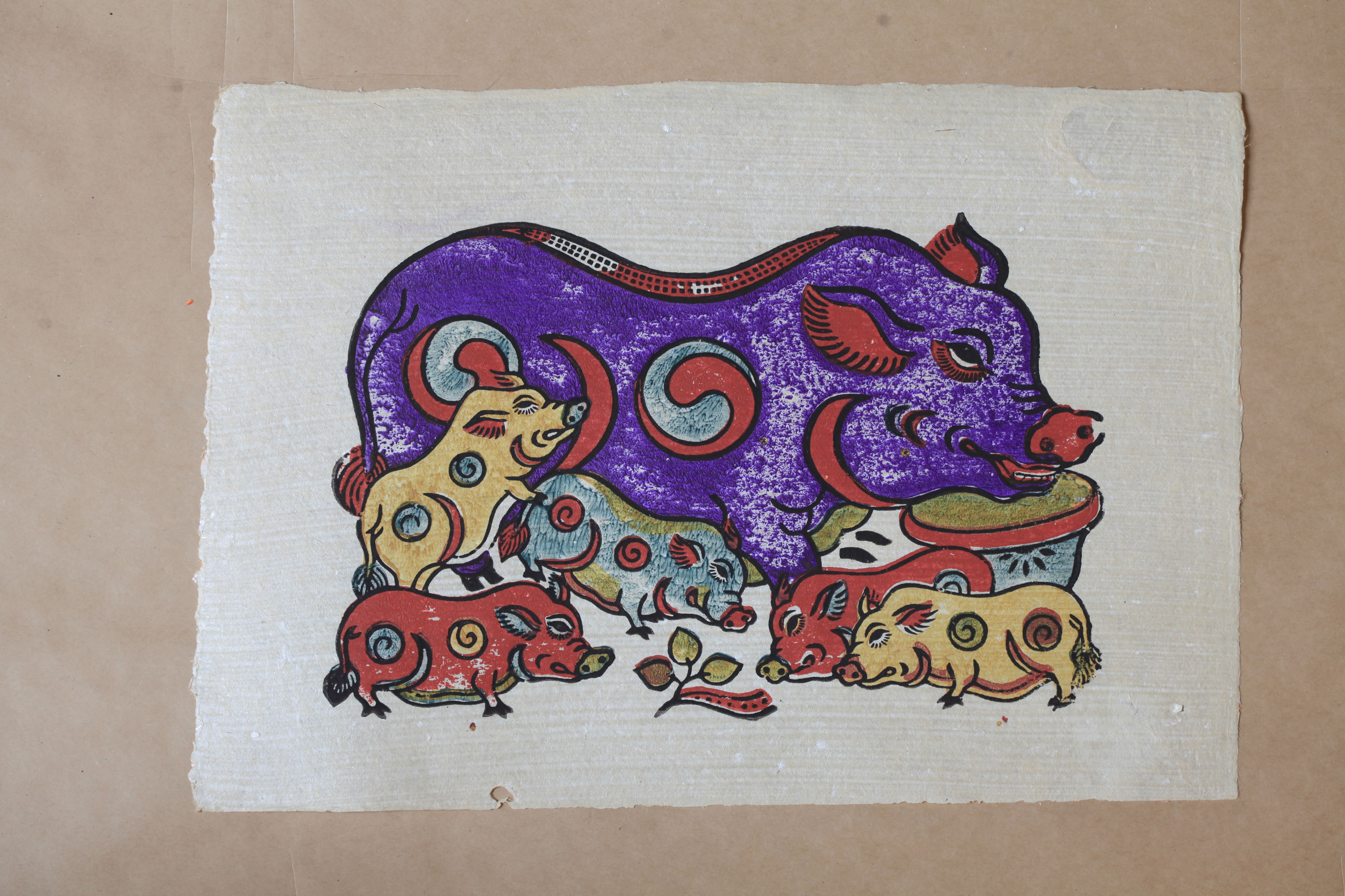 Lợn có mặt nhiều hơn trong các dòng tranh dân gian. Thậm chí, nhắc đến tranh Đông Hồ là người ta lại nhớ đến một dòng tranh lợn gà như câu thơ của thi sĩ Hoàng Cầm: “Tranh Đông Hồ gà lợn nét tươi trong/ Màu dân tộc sáng bừng trên giấy điệp”. Hình tượng con lợn trong tranh dân gian Đông Hồ biểu tượng cho sự sung mãn, hạnh phúc. Đối với nhà nông, không gì bằng cuộc sống no đủ và bình yên, quanh ngôi nhà tranh vách đất, con lợn kiếm ăn quanh quẩn trong vườn (như tranh “Lợn ăn lá ráy”). Con lợn còn thể hiện sự phồn thực, con đàn cháu đống (như tranh “Đàn lợn”). Tranh vẽ con lợn khá siêu thực, thân lợn được tả theo góc nhìn ngang, nhưng mõm lợn lại theo góc nhìn thẳng. Sự phối màu rực rỡ từ những màu gốc chế từ nguyên liệu dân gian dễ kiếm là đặc trưng độc đáo của dòng tranh này. Đôi khi, lợn lại được in màu đen đơn giản để khi cúng lễ đốt đi với ý nghĩa tâm linh là gửi xuống âm phủ cho người thân khuất núi.