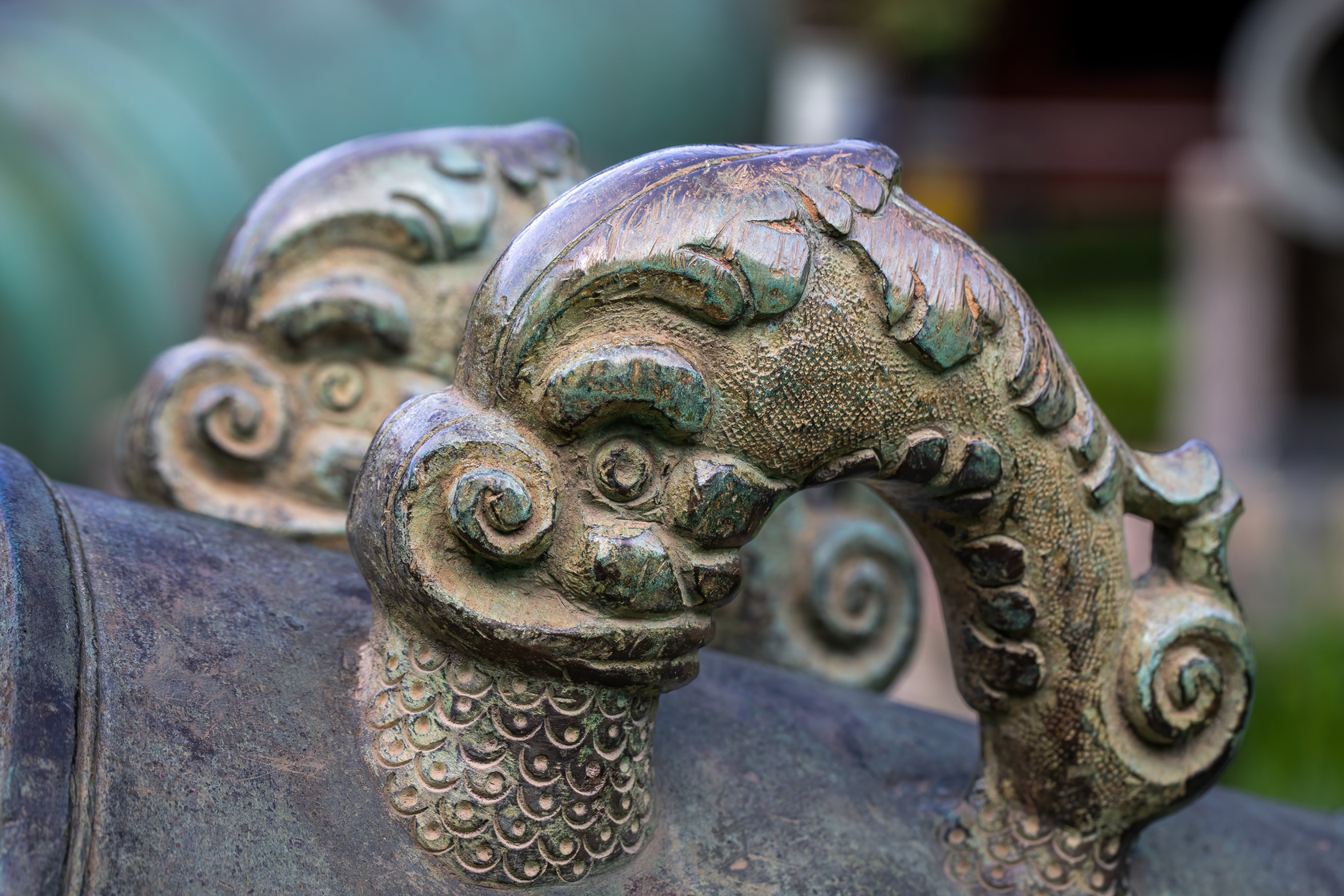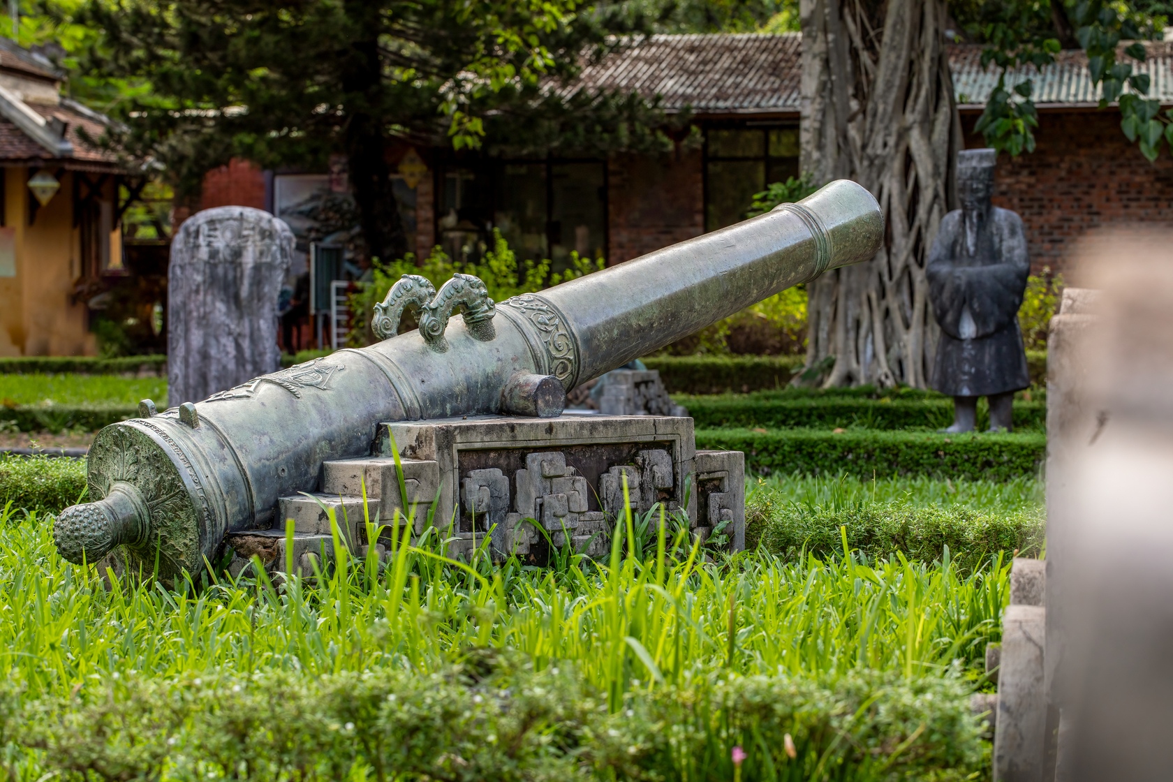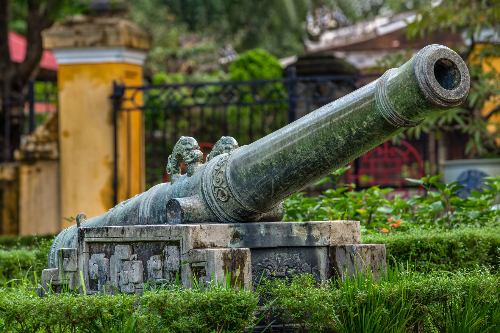 Trải qua hơn 300 năm dâu bể, những khẩu thần công đã lên ten xanh màu thời gian nhưng cũng vì thế chúng lại mang vẻ đẹp cổ kính và huyền bí lạ lùng.
