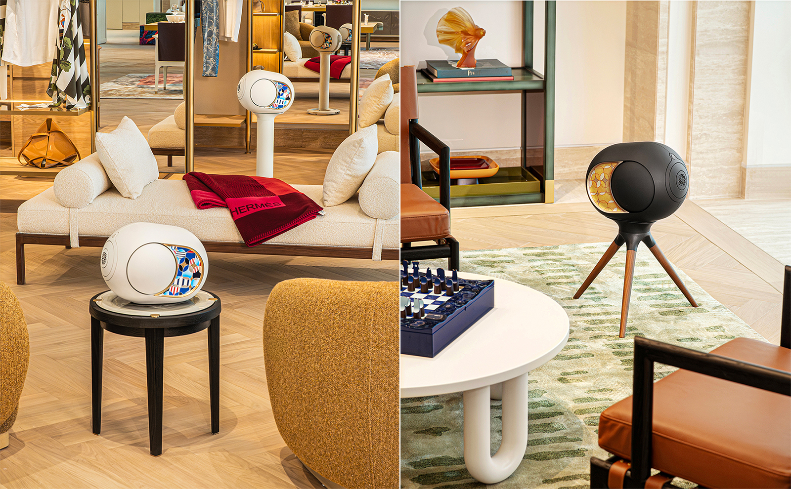 Điểm nhấn của lần hợp tác này là hai phiên bản đặc biệt với lớp sơn mài thủ công trên tấm chắn hai bên loa do đội ngũ nghệ nhân Hanoia thực hiện. Với phiên bản Light Pearl, các nghệ nhân sử dụng nền trắng ngọc trai của loa, kết hợp họa tiết sơn mài được lấy cảm hứng từ quốc kỳ Pháp cùng các đường kẻ sọc mang phong cách Pháp. Đây vừa là lời tri ân tới quê hương của Devialet, vừa tạo ấn tượng thanh lịch cho không gian nội thất hiện đại.