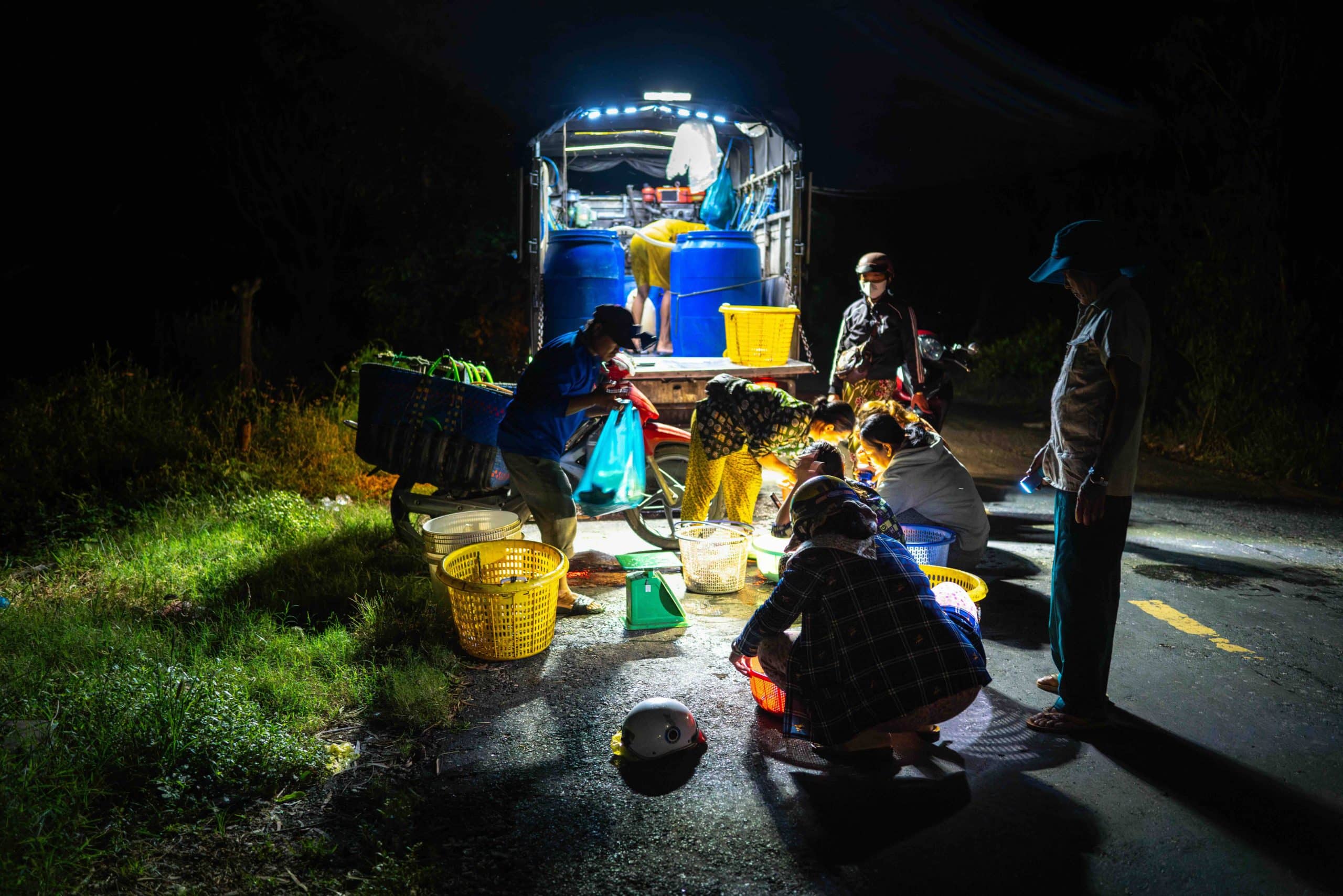 Ngư dân thường giăng câu, thả lưới, đặt lú ban đêm tại các dòng kênh nội đồng Tha La, Vĩnh Tế, giáp biên giới Campuchia. Đến khoảng 3h sáng, gió xào xạc trong màn đêm tĩnh mịch, gióng tai đã nghe tiếng các ghe, xuồng, vỏ lãi lạch tạch từ phía xa đổ về tập kết. Lúc này, các tiểu thương tụ lại hỏi chủ ghe khuya nay bắt được gì và cùng trao đổi làm nên không gian có phần ồn ã hơn. Sau đó, họ cùng nhau mang các sản vật đồng quê lên bờ dọc kênh Tha La để bán và cân ngay tại chỗ. Bà con thường đốt lá dừa khô tạo khói để xua muỗi. Trên phía đầu cầu Tha La có bố trí đèn đường nhưng không đủ ánh sáng, do đó như một thói quen, người bán vẫn không quên đội trên đầu chiếc đèn rọi cá, còn người mua mang theo chiếc đèn pin rọi đường nên quan sát xa xa giống như ánh sáng đom đóm lập lòe, ma mị trong đêm.