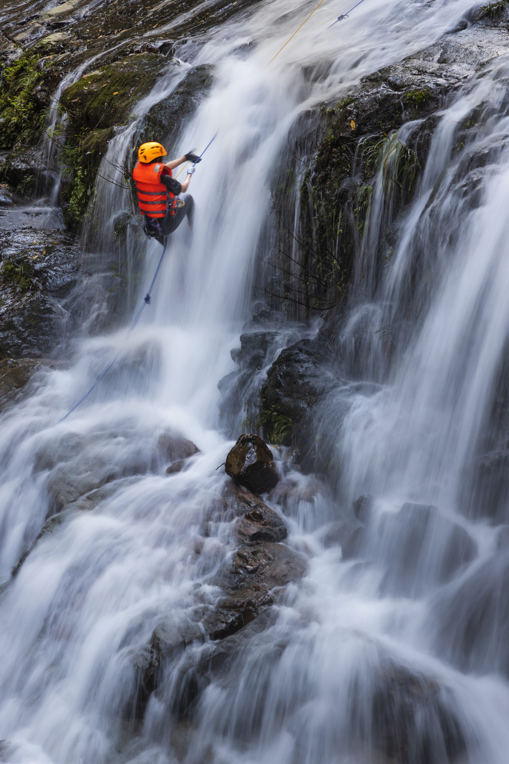Từ bìa rừng, lối mòn đổ dốc thẳng xuống suối Tiên, men theo dòng chảy len lỏi dưới tán rừng nguyên sinh, vượt qua vô số thác ghềnh, cuối cùng cả đoàn đã đến chân thác Dương Cầm. Con thác cao hơn 50m, dốc nghiêng khoảng 70 độ, nước chảy tràn trắng xóa. Nhìn từ trên cao, thác trông giống như phím đàn dương cầm nổi bật giữa nền rừng xanh. Con người bỗng chốc trở nên bé nhỏ trước thiên nhiên hùng vĩ. Porter vừa hỗ trợ từng người mang đai bảo hộ, vừa giới thiệu từng loại thiết bị, hướng dẫn kỹ năng sử dụng dây, móc khóa an toàn, kỹ thuật leo núi. Mỗi thành viên đều hồi hộp trước thử thách thức vượt thác – loại hình du lịch lần đầu tiên được đưa vào khai thác ở Việt Nam. Từng người bước đến chân thác, nắm chặt sợi dây thừng, dùng lực kéo bằng cả hai tay cộng thêm lực hỗ phía trên thác của 2 porter thông qua một dây kéo vừa để hãm, vừa để trợ lực, chậm chắc tiến từng bước. Tiếng thác ầm ào, từng tia nước dội xuống bắn tung tóe như níu lấy đôi chân hồi hộp của mỗi người. Lời động viên của porter bị tiếng thác nuốt chửng, những ngón chân bấm ghì xuống mặt đá, mắt lóa vì nước, tim đập như như trống nhạc, vừa leo vừa thở, tôi ngước nhìn lên quãng đường lên đỉnh dài như vô tận. Đến lượt mình, tôi phải dừng lại giữa thác vừa để hít hơi thật sâu, vừa trấn tĩnh lấy tinh thần bước tiếp. Sau một hồi chật vật và được porter hỗ trợ nhiệt tình, cuối cùng cũng lên đến đỉnh thác. Trong tôi bừng lên cảm giác chiến thắng sau khi làm được một việc tưởng như bất khả thi.