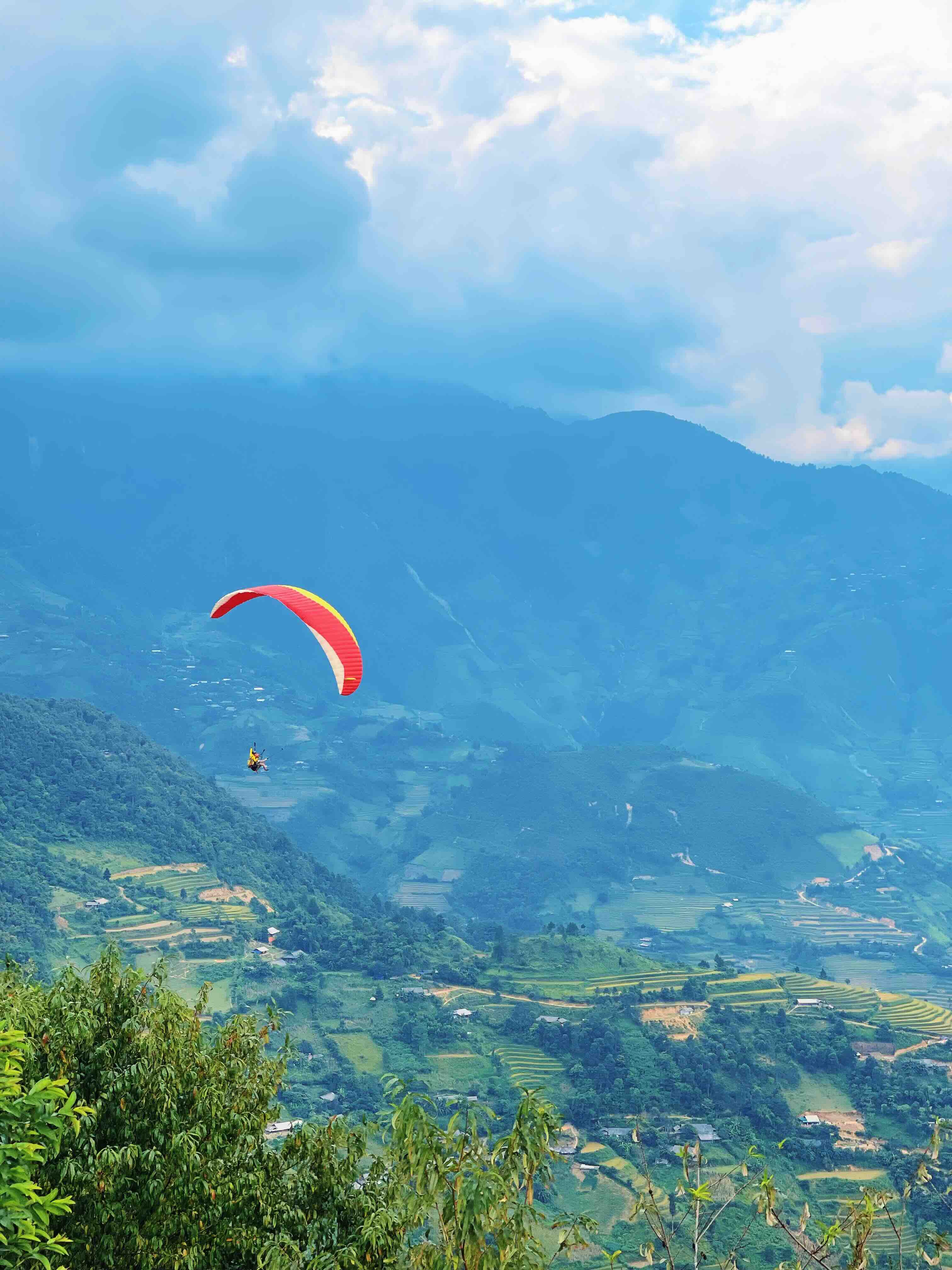 Con đường tôi đi uốn lượn qua đèo Khau Phạ – một trong “tứ đại đỉnh đèo” của Việt Nam bên cạnh đèo Mã Pì Lèng, Pha Đin và Ô Quy Hồ. Đứng nơi lưng chừng mây, tôi bắt gặp những cánh dù rực rỡ chao lượn trên không trung. Người ta gọi đó là “Bay trên mùa vàng” – một trải nghiệm mà nhiều du khách tìm đến để ngắm nhìn Mù Cang Chải từ trên cao. Khi gió nâng cánh dù bay lên, cả thung lũng vàng mở ra như một bức tranh sống động.