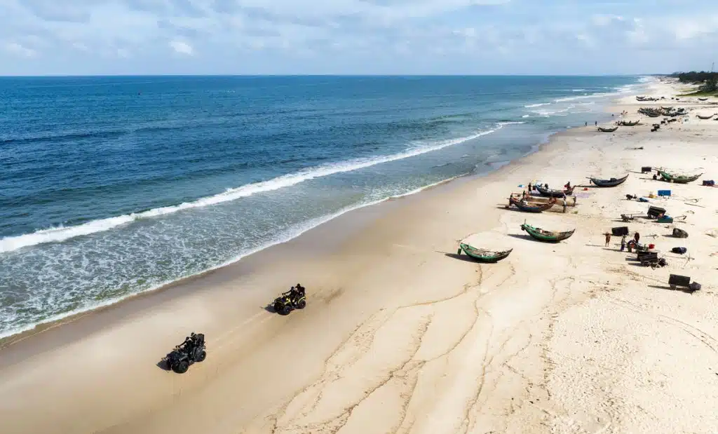 Vào buổi sáng đẹp trời, nắng như dát bạc lấp lánh trên mặt biển. Tôi cùng nhóm bạn quyết định dùng xe địa hình ATV tham quan miền cát theo một cách riêng. Từ quảng trường biển Bảo Ninh, men theo ngàn con sóng, chiếc xe địa hình đưa chúng tôi đến với làng Hải Ninh. Gió biển miên man thổi vị mặn làm mái tóc rối xù. Dọc theo triền cát có một loài cây dại, nở đầy hoa có hình dáng như con cầu gai với những chiếc gai tua tủa xung quanh, người ta gọi đó là hoa lông chông. Thuận gió, những bông hoa lông chông lăn tròn như chạy đua cùng đoàn xe dọc dài theo bãi cát. Mấy chú còng gió ngơ ngác nghe tiếng máy xe vội vàng lao nhanh về các lỗ nhỏ bên hốc cát. Những rặng phi lao cổ thụ thân xù xì đung đưa theo gió.