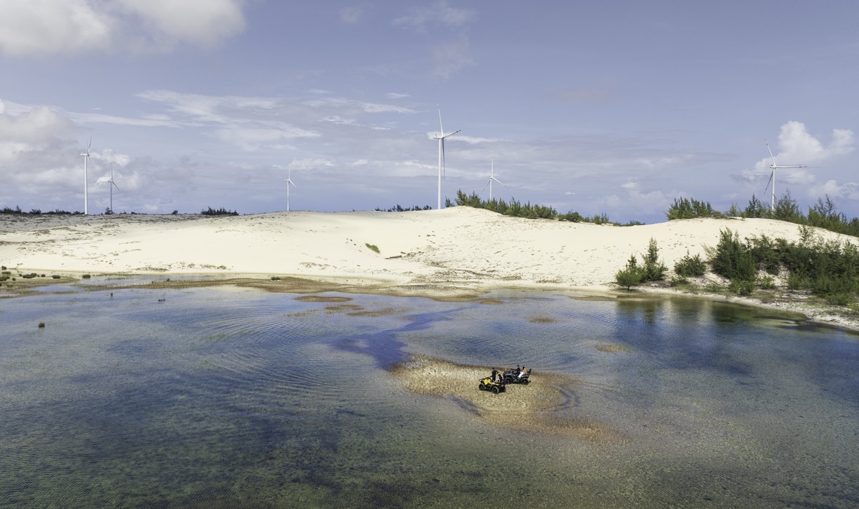 Làng Hải Ninh nay cũng đã đổi thay nhiều hơn trước, đặc biệt là ở đây đã mọc lên cả một “cánh đồng điện gió”. Những cột điện gió khổng lồ nằm xen giữa các đồi cát, hồ nước tạo thành một “tiểu sa mạc” nên thơ, trở thành điểm tham quan, checkin mới lạ cho giới trẻ. Giữa không gian mênh mông cát trắng, những trụ điện gió phản chiếu xuống hồ nước lung linh. Sau khi thỏa sức tạo dáng cùng xe địa hình để chụp ảnh, chúng tôi chạy một vòng quanh các cột trụ để ngắm nghía. Đến khi mặt trời đã đứng bóng, cả nhóm ghé vào một nhà hàng ven biển. Bữa trưa nhẹ nhàng với tô mì tôm mực do chính người dân đánh bắt từ biển trước làng. Dùng xong bữa, mỗi người tìm một chiếc võng nằm đung đưa hóng gió từ biển mát rượi.