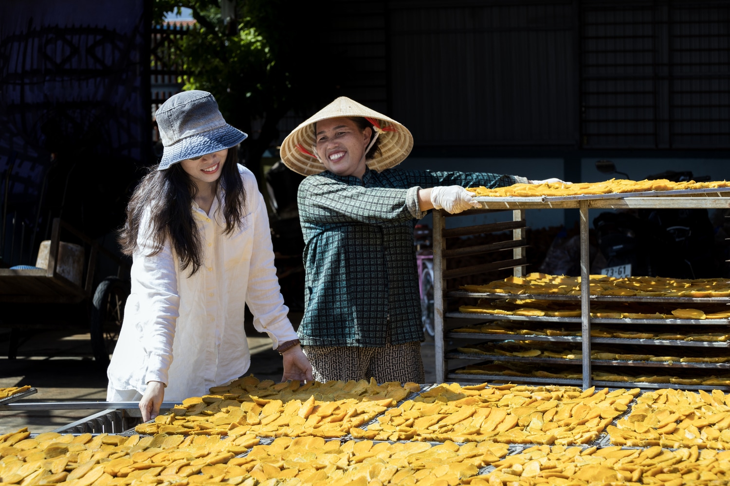 Giêng hai khoai bầu – câu tục ngữ ấy là phương ngôn về ẩm thực làng cát, dấu ấn lịch sử một thời đói kém. Còn ngày nay, khoai làng cát đã trở thành món đặc sản dân dã dùng để làm quà tặng cho khách du lịch xa gần. Dừng chân tại cơ sở chế biến khoai deo lớn nhất làng. Chúng tôi không khỏi ngạc nhiên về không khí khẩn trương làm việc của bà con. Lân la bắt chuyện, tôi được người dân chân chất chia sẻ câu chuyện làm nghề. Khoai lang sau khi thu hoạch phải lấy chăn vải ủ khoảng 3 – 5 ngày cho xuống mật sau đó mới rửa sạch, nấu chín rồi bóc vỏ, xắt lát và phơi được nắng thì mới dai và ngọt. Nghe thì đơn giản vậy, chứ ngồi quan sát mới cảm nhận được, lát khoai đó ngon ngọt, đảm bảo vệ sinh chắc chắn là nhờ sự tỉ mẫn và thấm cả mồ hôi công sức bao ngày tháng của người làm. Khoai deo bây giờ đã được đóng gói bao bì đẹp mắt, theo chân du khách đi khắp mọi miền. Để đáp ứng nhu cầu thị trường, hiện nay nhiều cơ sở chế biến khoai deo ở Hải Ninh đã đầu tư máy sấy, đảm bảo cho việc chế biến khoai cả những giai đoạn trời không có nắng.