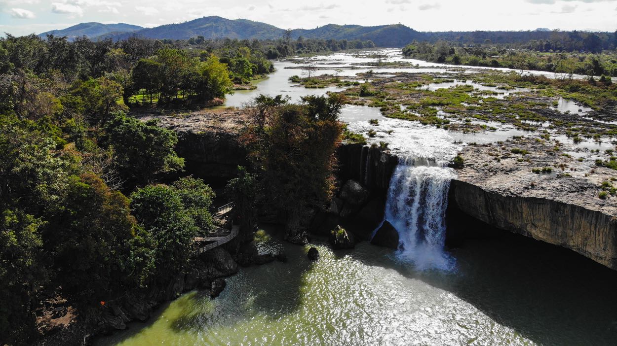 Những câu chuyện xoay quanh dòng Sêrêpôk chưa kịp khiến tôi hết bất ngờ thì tôi đã được dẫn tới ngọn thác đầu tiên của dòng sông này, nơi được vua Bảo Đại đặt tên là Gia Long, hay còn được gọi là thác Dray Sáp Thượng. Tôi như bước vào một thế giới khác khi xung quanh chỉ là màu xanh cũng những cánh rừng nguyên sinh và nổi bật là dòng nước đổ từ độ cao khoảng 30m xuống. Tôi mon men theo cầu treo nhỏ để đi xuống phía hồ nước xanh ngọc bích tự nhiên ở ngay dưới thác Gia Long, nơi có một thanh niên Ê Đê chờ sẵn bên một chiếc xuồng phao để dẫn tôi tiếp tục hành trình khám phá dọc sông Sêrêpôk.