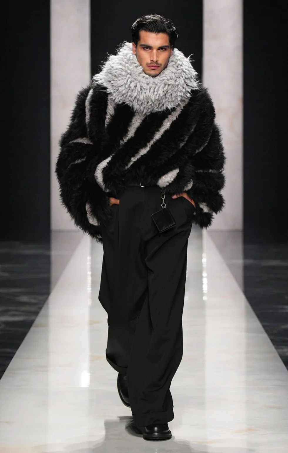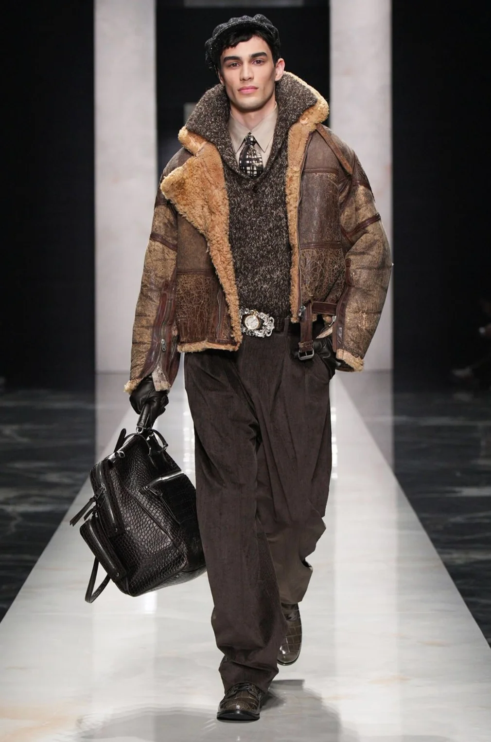 Nhiều thiết kế mang tính phóng đại – từ áo knit cỡ lớn, lông thú dày như yeti, cho đến áo choàng họa tiết da báo gợi liên tưởng Hugh Hefner – đều là những khoảnh khắc Dolce & Gabbana “chơi” với chính di sản thẩm mỹ của mình. Các chi tiết thể thao như bóng đá, bóng rổ xuất hiện xuyên suốt, gợi lại thời kỳ David Beckham trở thành biểu tượng thời trang nam đầu thập niên 2000 – một giai đoạn mà Dolce & Gabbana từng định hình mạnh mẽ cách đàn ông ăn mặc.
