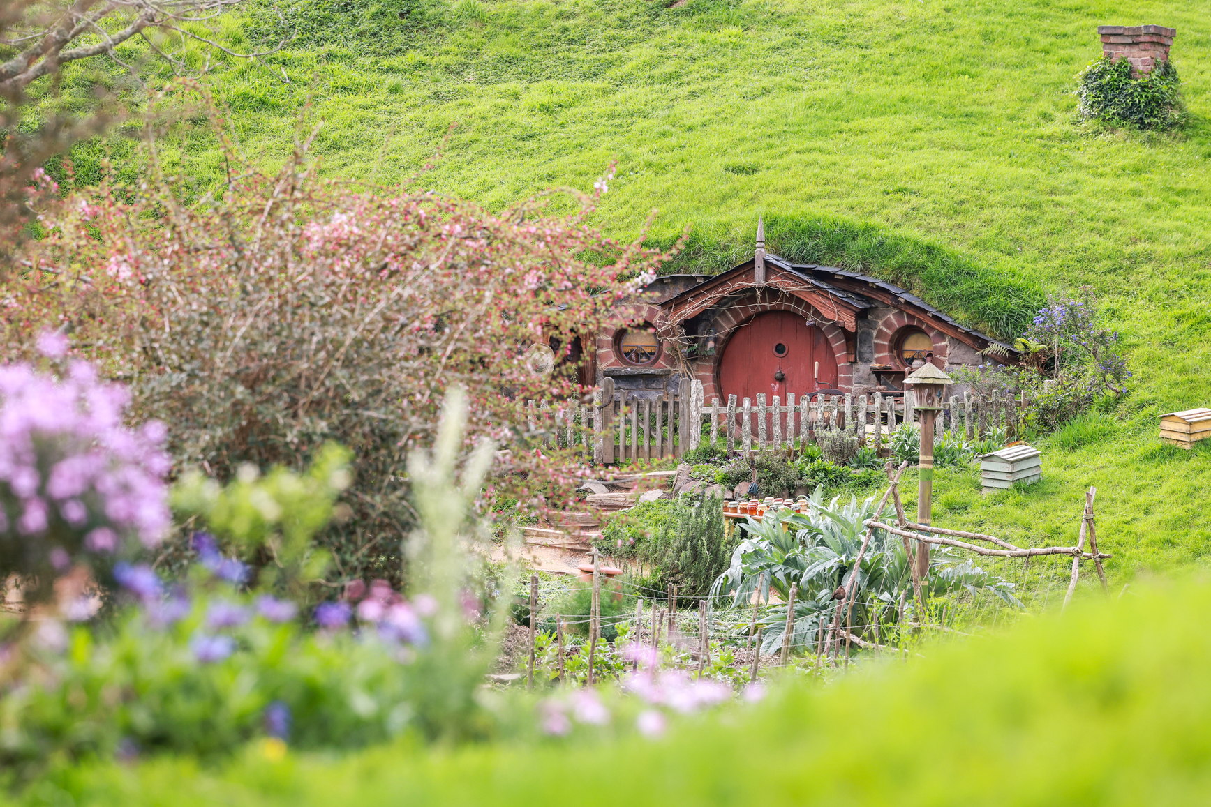 Tôi trở lại làng Hobbit và ở lại đây một ngày trong buổi sáng mưa phùn âm u và chiều nắng vàng rực rỡ, nên ảnh lúc ru tình thăm thẳm, lúc quang hoa rực rỡ. Lần trở lại này, vẫn say mê những đồi cỏ bạt ngàn xanh mướt cùng những chú cừu trắng muốt như bông. Sự giao thoa của không gian và thời gian là đũa thần hóa phép ngôi làng thành thế giới cổ tích kỳ ảo. Gam màu dịu nhẹ của thời gian hòa cùng sắc màu rực rỡ của những ngôi nhà Bag End khiến cho tôi ngơ ngẩn mãi. Đứng ngắm miên man vệt nắng chạy từ đồi này qua đồi khác. Ngôi làng cổ tích Hobbit là nơi đoàn làm phim Đại chiến 5 cánh quân – The Hobbit, Chúa tể của những chiếc nhẫn dùng làm bối cảnh. Trong phim, 44 ngôi nhà với cửa tròn bé xíu nằm nửa trong lòng đất nửa trồi lên đồi nhìn rất ấn tượng, pha chút bí ẩn. Quanh nhà còn có khu vườn rau nhỏ xinh cùng những vật dụng của người lùn.