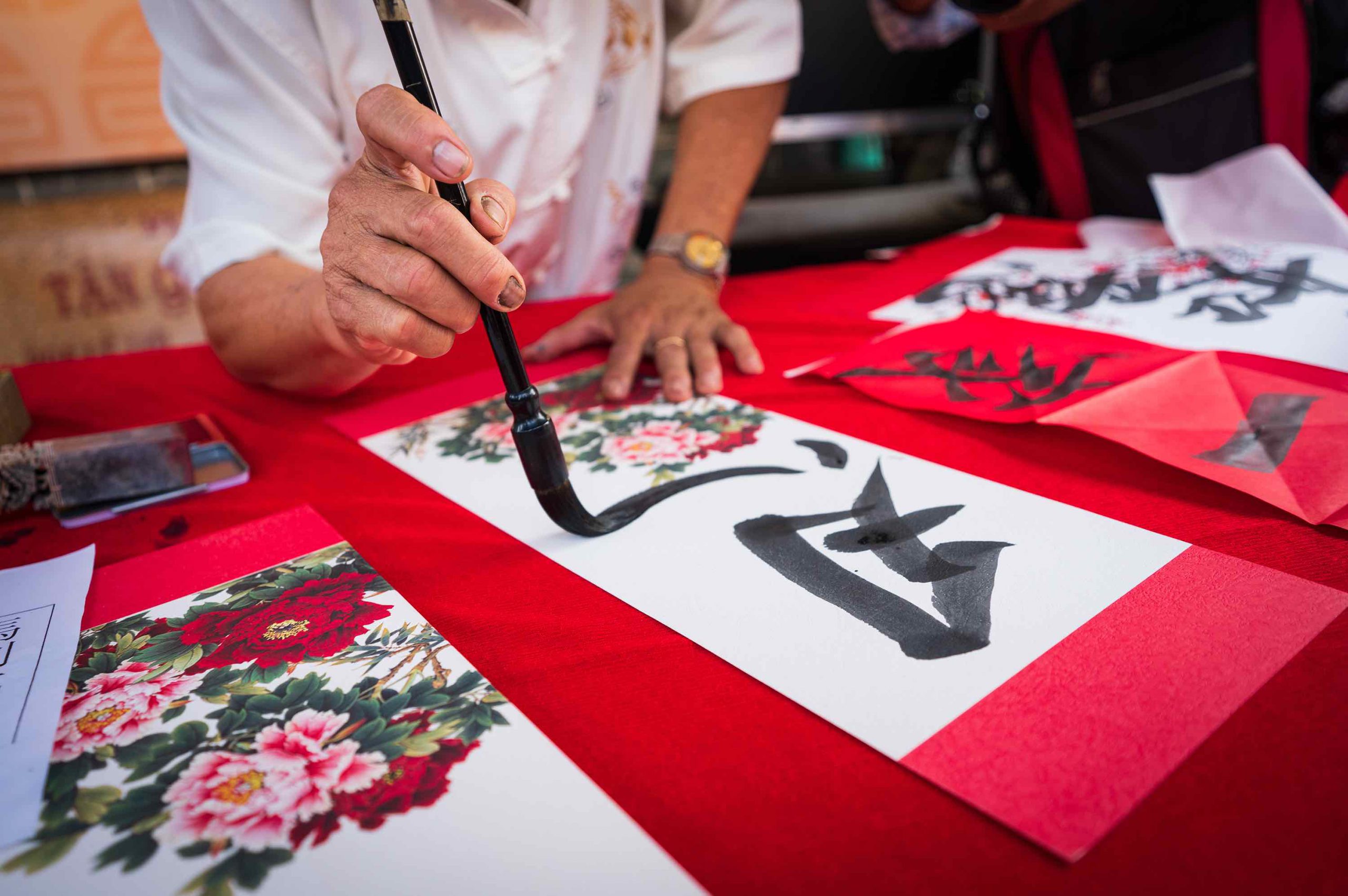 Sau phần lễ khai mạc là màn trình diễn thư pháp độc đáo do các nghệ nhân thuộc câu lạc bộ Thư pháp người Hoa thành phố Sóc Trăng thực hiện. Những tay viết liễn bằng chữ Hoa trên giấy đỏ với những câu có nội dung giáo dục, phát huy truyền thống tốt đẹp của tổ tiên về nhân – lễ – nghĩa – trí – tín hay nét đẹp chân – thiện – mỹ, tặng cho du khách với mong muốn đem lại may mắn cho nhiều người, cũng như góp phần lưu giữ nét đẹp truyền thống trong ngày Tết.