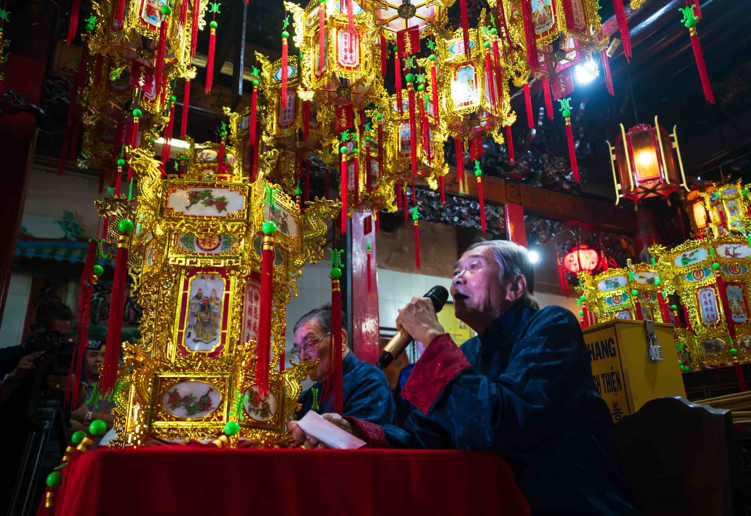 Để tăng thêm tình đoàn kết cộng đồng và cùng nhau đóng góp gây quỹ từ thiện, ban tổ chức lễ hội tổ chức hành đấu giá đèn lồng ở chùa Ông Bổn. Các vị chức sắc thắp nhang tiến hành nghi thức dâng lễ cúng tết Nguyên tiêu và phát đèn. Mỗi chiếc đèn lồng đều có một câu chúc phúc đặc trưng, mang lại ý nghĩa tinh thần rất giá trị cho những nhà kinh doanh người Hoa trong năm mới.