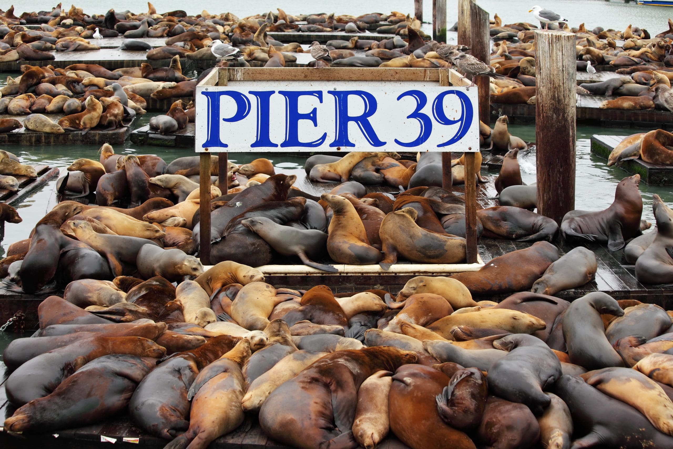 Xuất phát từ cầu tàu số 39 – Pier 39, ngôi nhà của hàng trăm chú sư tử biển hiện ra, du khách ngay lập tức đã mải mê ngắm nhìn và săn ảnh. Điều thú vị là không những tôi mà rất nhiều du khách đều gọi chúng là hải cẩu (seal) trong khi đây là loài sư tử biển vùng California (California sea lion). Hướng dẫn viên chỉ cho chúng tôi cách phân biệt 2 loài này: sư tử biển có vành tai, trong khi hải cẩu thì không có.