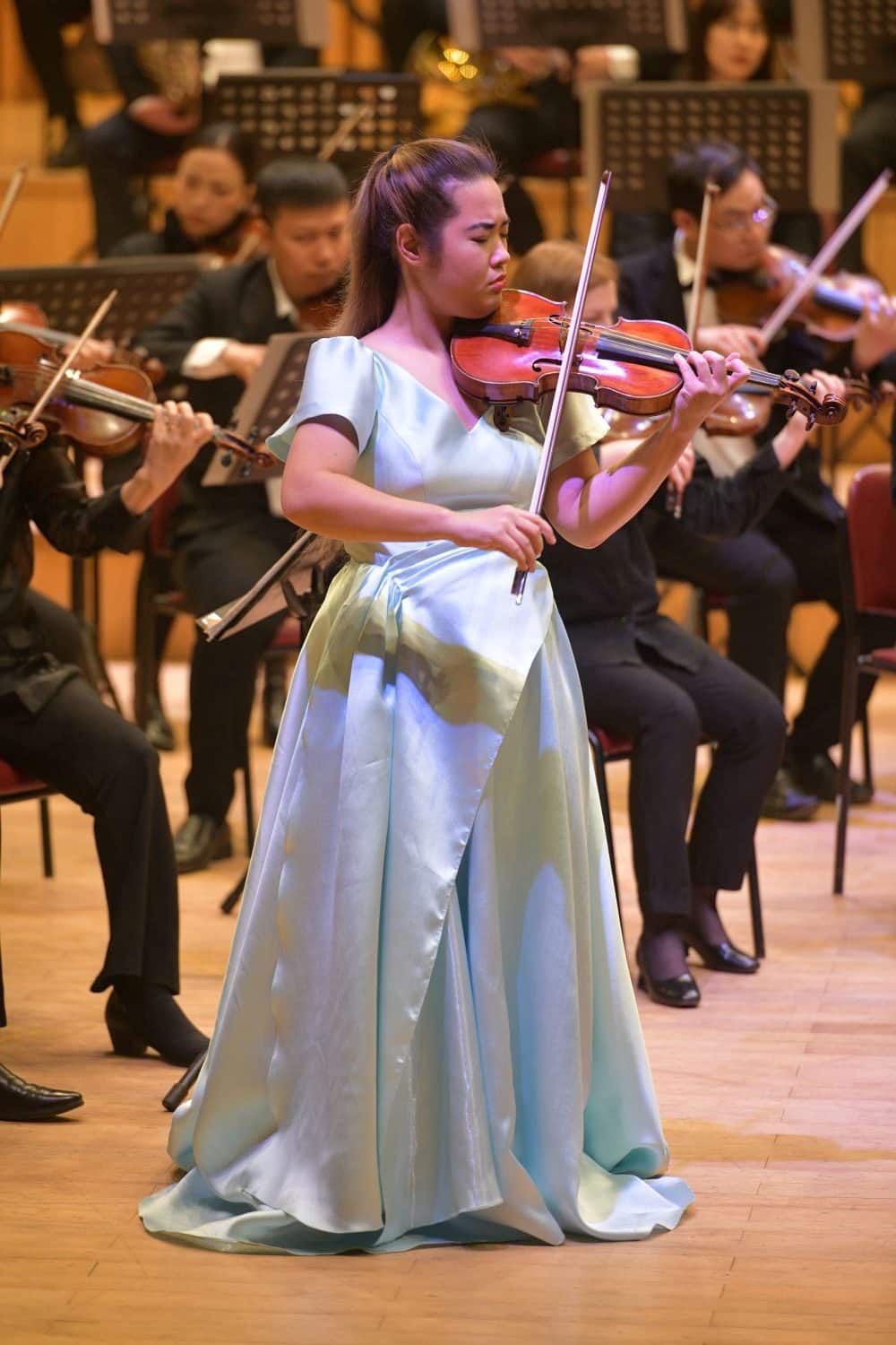 Cô gái trẻ sinh năm 1998 say sưa bên cây violin Bernadel (ra đời năm 1889) để âm thanh khi thì cao vút, khi trầm hùng, lúc lại rộn ràng, mạnh mẽ. Bằng một cách nào đó, tiếng violin từ cây đàn cổ ấy tạo nên những “sợi âm thanh” vút lên, len lỏi giữa bè viola, kèn, trống, và cả những cặp violin đồng lứa, để mở ra một sắc màu riêng trong tổng thể âm sắc chung của dàn nhạc.