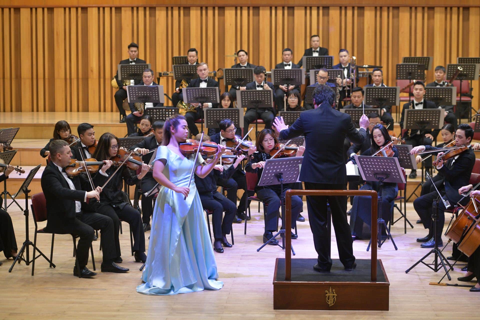 Buổi tổng duyệt cuối cùng trước đêm diễn thứ hai của chuỗi “Bầu trời xanh” diễn ra trong Phòng Hòa nhạc Lớn, Nhạc viện Hà Nội. Vị nhạc trưởng mô tả những âm thanh “pặp, pặp, pặp” đầy dứt khoát để nhóm kèn và bộ gõ bắt đúng sắc thái của chương nhạc. Từ phía xa, nghệ sĩ violin Đỗ Phương Nhi cũng chăm chú dõi theo các lớp hòa âm để cùng nhạc trưởng điều chỉnh tempo trước khi cô độc diễn phân đoạn concerto cho violin của Tchaikovsky.