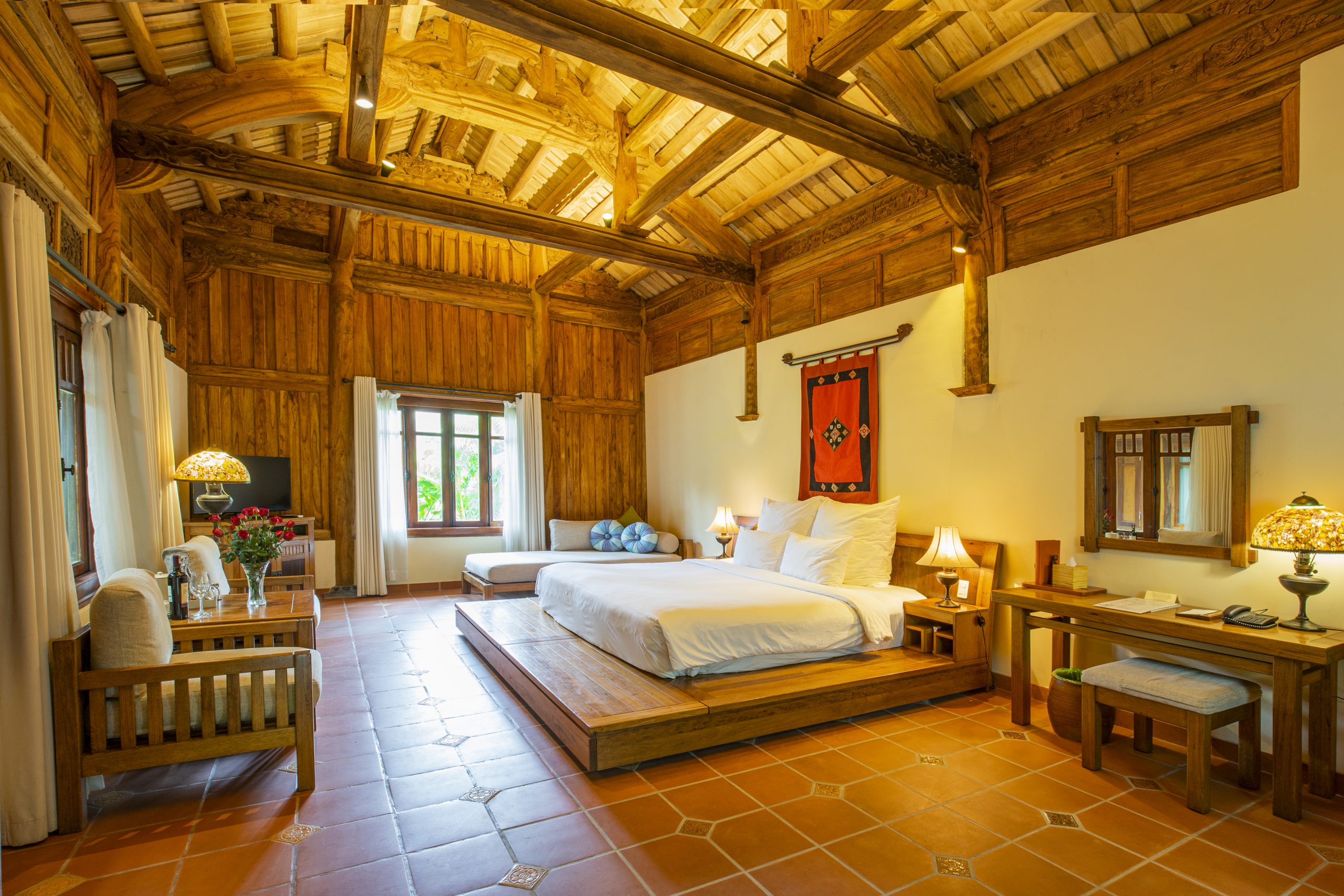 172 căn bungalow rộng ở Emeralda được thiết kế như những ngôi nhà ba gian ngày xưa, vẫn là mái đỏ, vẫn là đà gỗ được chạm khắc tinh xảo, vẫn là gạch đỏ lát nền mang đến cảm giác mát dịu ở lòng bàn chân, vẫn là hệ thống cột gỗ chắc nịch, vẫn là then cửa cài gỗ mộc mạc. Ở trong không gian thôn dã này, mới thấy nhớ và quý trọng những nếp nhà xưa, những mảnh hồn làng ngày xa xôi…