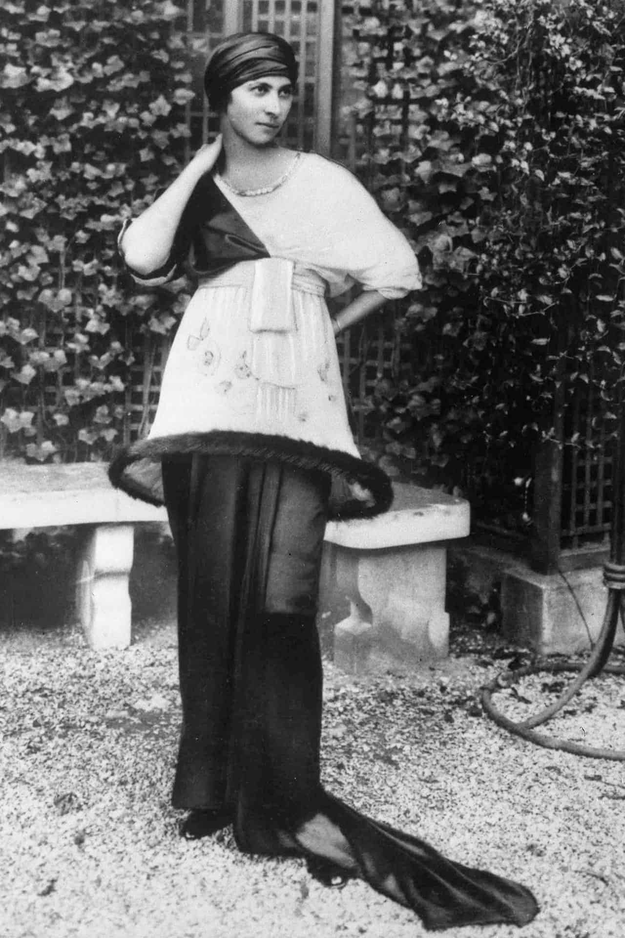 At the time, designer Paul Poiret diverged from Worth, whose dresses were structurally massive with large skirts, layered with silks, voiles, and most notably, tightly cinched at the waist by corsets. Poiret felt the corset constrained women’s bodies as well as the potential of new cuts on the old dress. He appreciated the ease and spaciousness of the kimono and the decorative style of interesting motifs intertwined with minimalist lines. Poiret longed to incorporate art into his fashion, and his dresses and robes sometimes resembled a contemporary Matisse painting: a structure that followed the natural body like a canvas primed for painting, allowing the depiction of plants and trees to dance upon it. Paul Poiret redefined the concept of a fashion designer as we understand it today: not necessarily a tailor, but a visionary deeply immersed in the currents of art and society.
