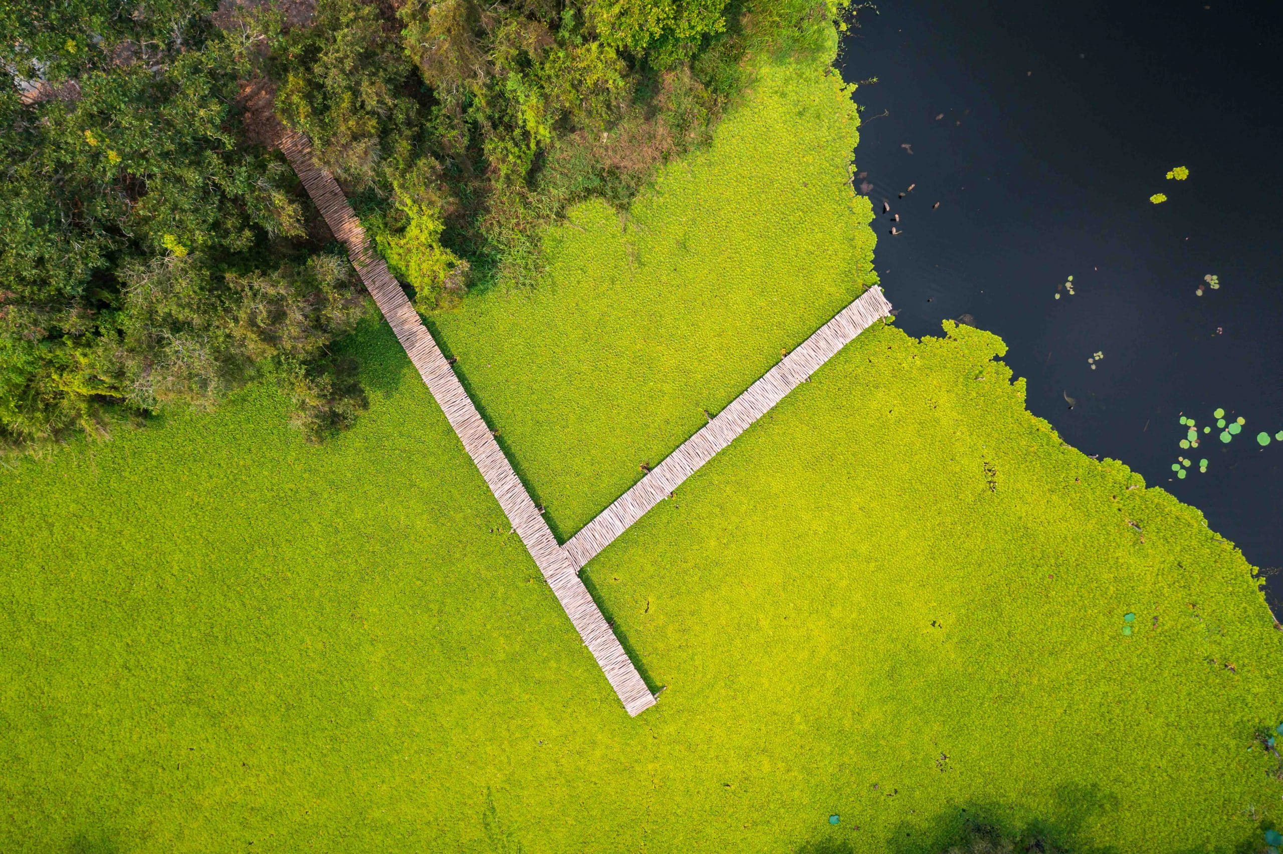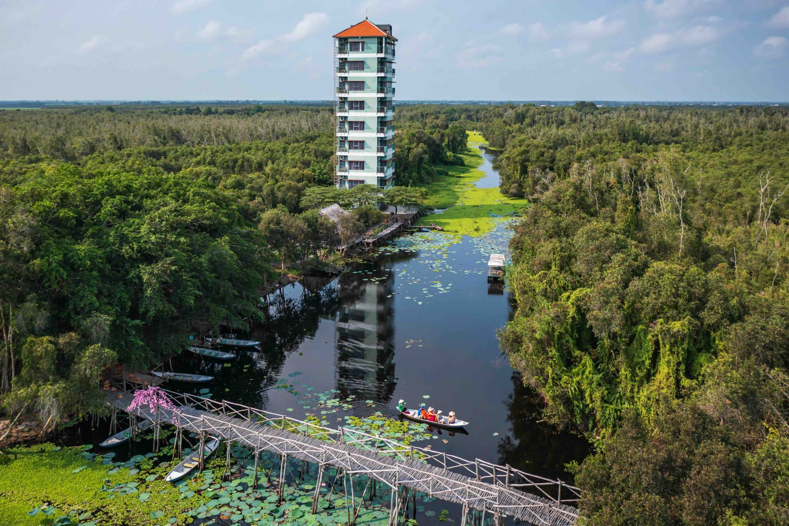 Upon reaching the shore, the journey continues along a scenic forest path, one of the most beautiful in the Mekong Delta. Stretching about five km and just one meter wide, the winding trail weaves through towering melaleuca trees, leading to an X-shaped bridge, Ban Nguyet (semicircle) Lake, and an 18-meter-high observation tower offering panoramic views of the Dong Thap Muoi region. Many visitors stay to witness the breathtaking sunset, when flocks of white storks fill the sky.