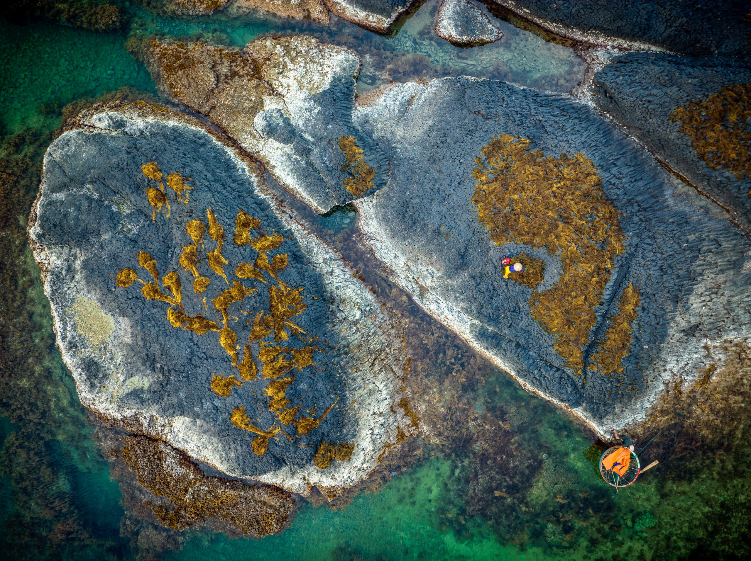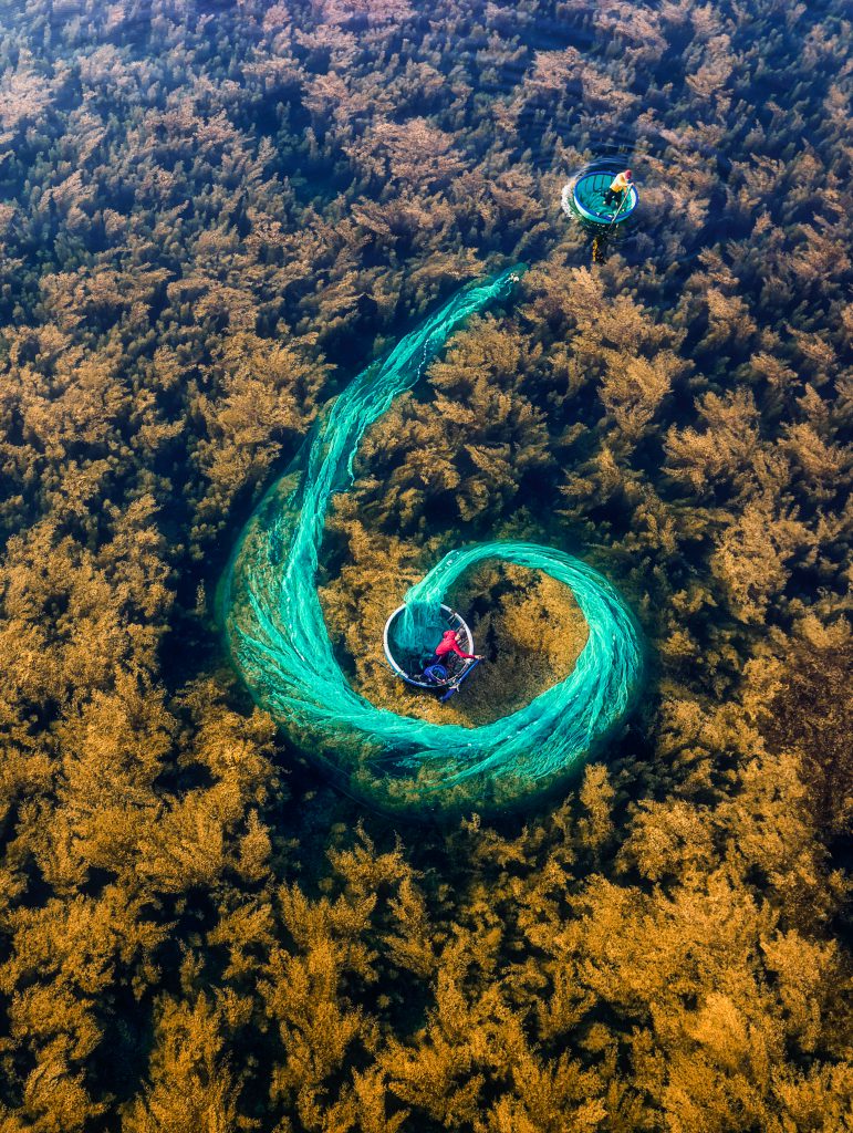 During the harvesting season, photographers from across the country flock to Chau Thuan Bien to capture magnificent photographs and learn about this craft. From above, the scenes are vibrant, as spectacular green nets contrast with the brown sargassum, while boats rowed by strong tanned men seem to dance around the nets. Among the vast waters and skies, people on small coracles try to make a living from Mother Nature’s gifts. While hardscrabble, their lives have always been lively, with no dull moments as they work amidst the deep blue sea, the sun, and the wind.