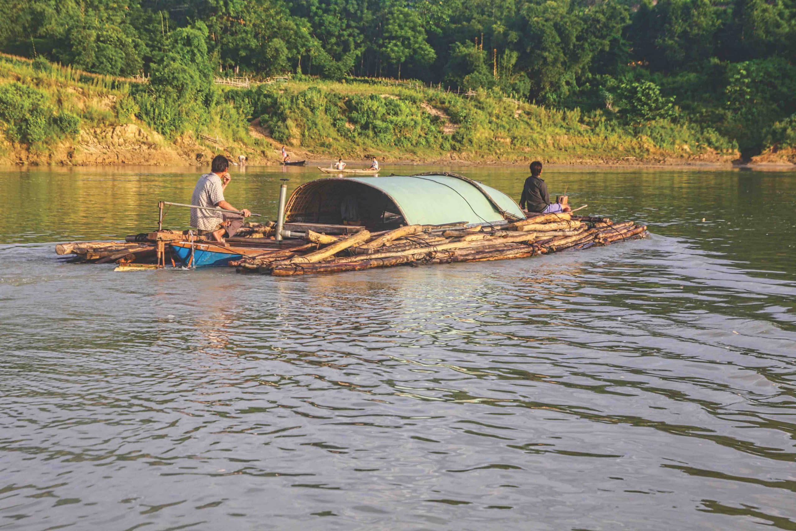 As our boat drifted past Que Lam Suspension Bridge and rounded a bend, the river opened up, vast as a lake. Once again, the landscape astounded us. Two forested arms converged in the middle, a still-dark mountain range formed the backdrop, and over the expansive “lake”, a thin mist rose up the mountainsides while the water’s edge shimmered with the golden light of dawn.