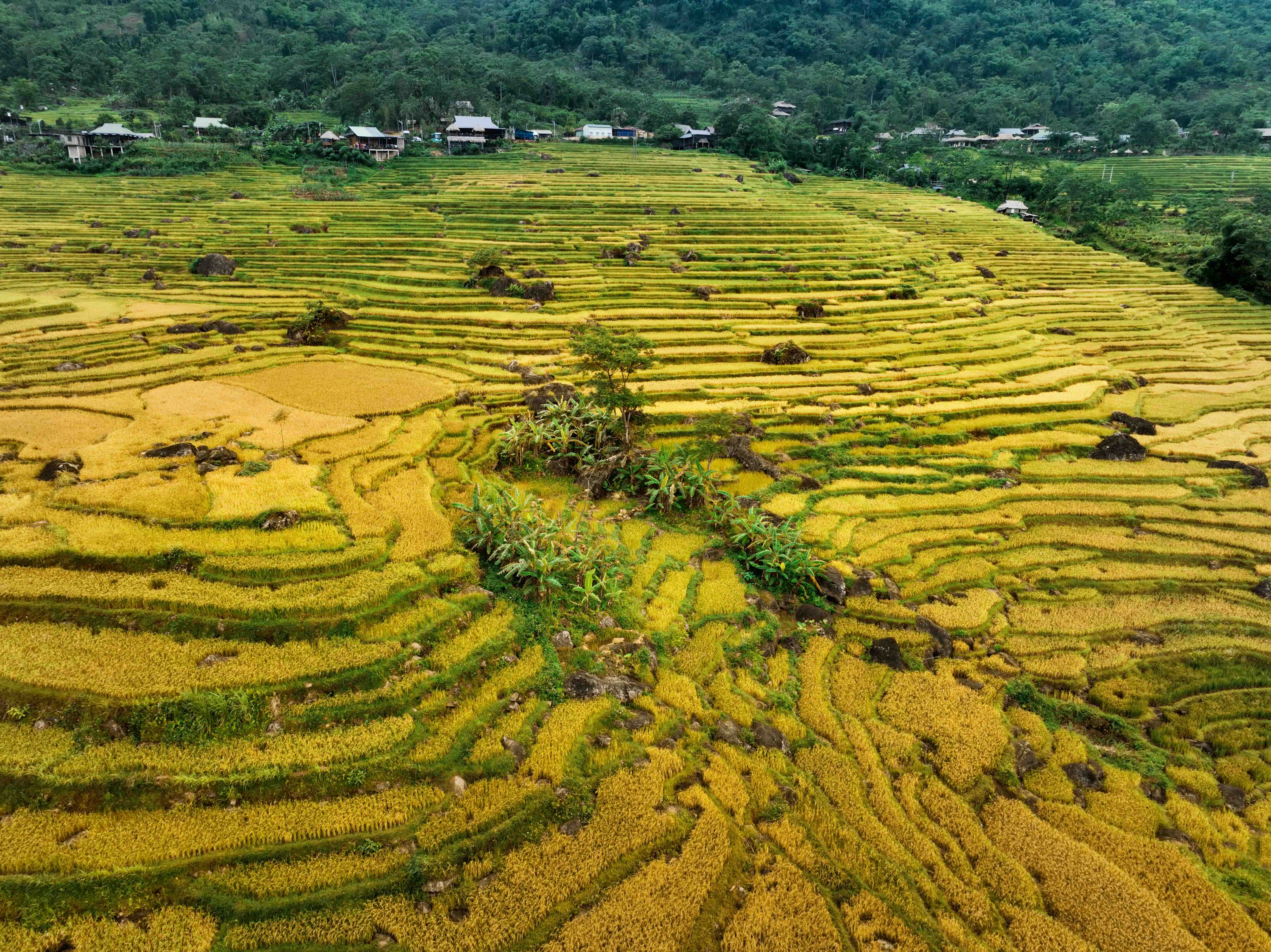 In September and October, when the rice ripens, travelers from the lowlands follow the scent of the highland harvest to witness terraces of golden grain cascading down the mountain slopes – a heritage preserved for generations by the Muong and Thai people of Pu Luong. Perched over 1,200 meters above sea level, Pu Luong enjoys a cool climate year-round. Peaceful valley villages come alive during the harvest season, as visitors arrive to admire the ripening fields, stay in stilt-house homestays such as Thai House Pu Luong, Lua Pu Luong, or Pu Luong Tree House, wade in streams, bathe under waterfalls, and explore local life. Guests can also learn about traditional crafts such as weaving and bamboo and rattan work, forage for medicinal plants, and savor the distinctive cuisine of the Muong and Thai communities.