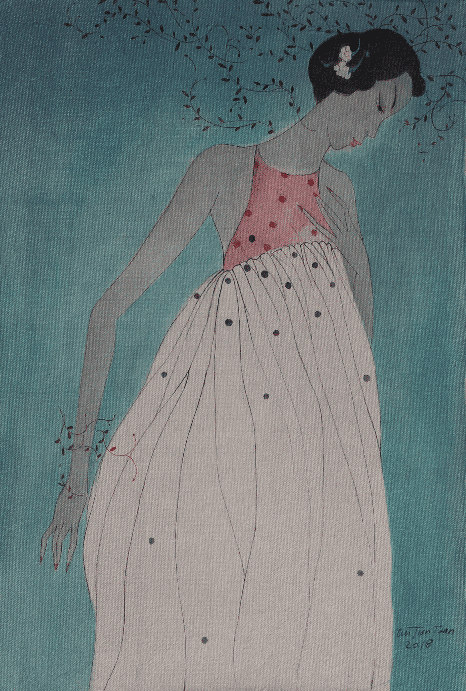 The women in works by Bui Tien Tuan reflect the changes in society’s outlook of life and femininity. His style has drifted far away from realism, leaving much space for the creation of a subjective style. His paintings border on mischievous simplicity, with brushstrokes that are moderated but profound, focusing ultimately on personal feelings and patterns above all else.