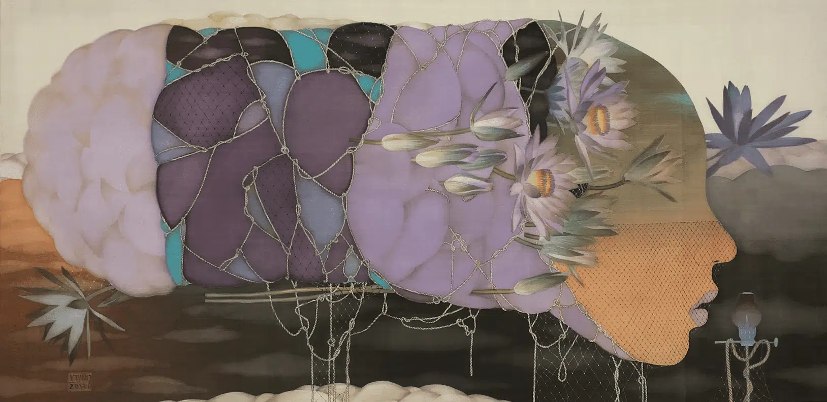 A leading veteran on the contemporary silk painting landscape is Ho Chi Minh City-based Bui Tien Tuan (born 1971). The artist tends to work on a large scale, with a focusing on negative space and a highly individual style. The key subject of his works is the female body, and Tuan shifts his perspective to capture physical curves and eye-catching shapes. Rather than simply capturing beauty, Tuan’s work takes on a range of faces and expressions, dark and edgy juxtaposed with enchanting and harmonious.