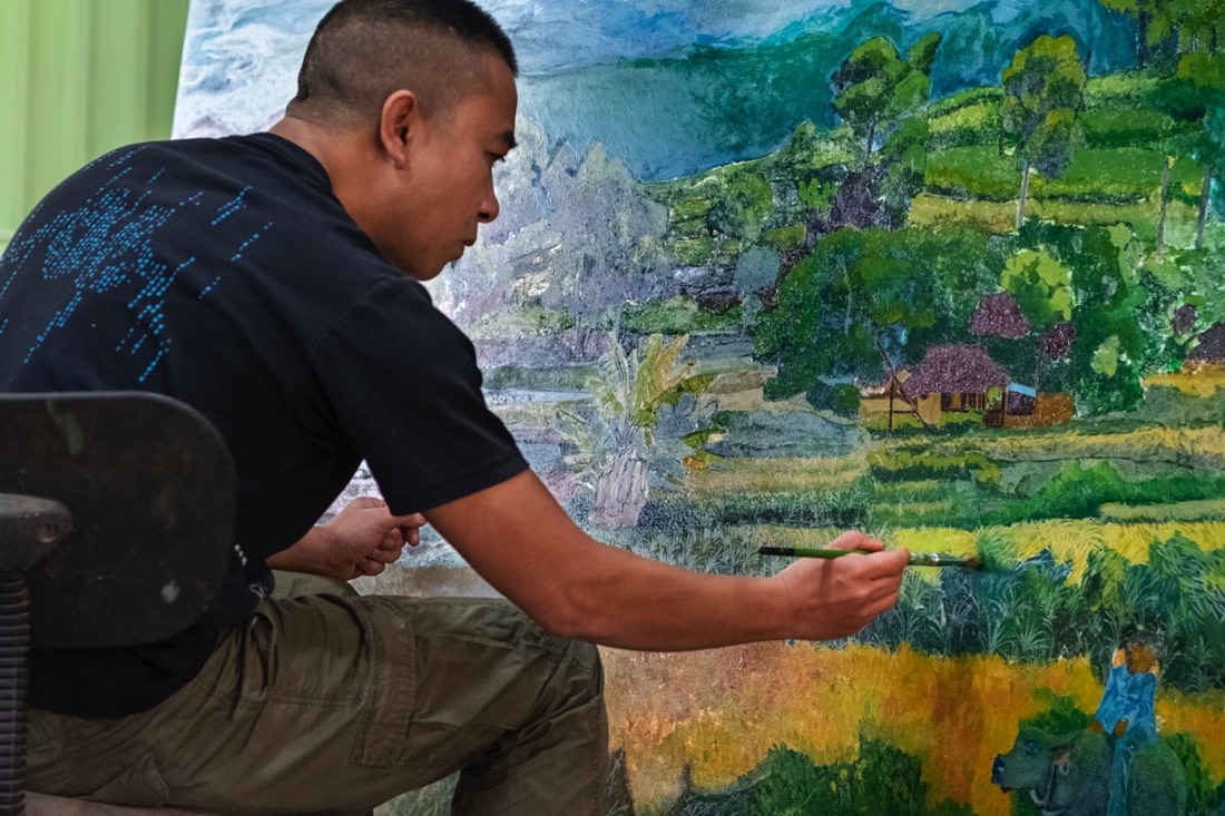 As for Trinh Vu Hieu, his artistry is distilled from long apprenticeships across the country, where he learned to create “artistic items that can be used in daily life”. This message is conveyed through each of Mr. Hieu’s vases, jars, statues, and ornaments. These sophisticated items are adorned with floral motifs, the Buddha’s face, images of the Three Courts and Four Palaces, the Three Palaces of the Mother Goddess, and the Jade Emperor. His pottery also has a rustic feel with brown, gray, or blue glazes, mostly made from natural materials. In addition to pottery, Mr. Hieu also paints in lacquer and oil, creating shapes with various materials. Each work has a strong contemporary breath and rustic style yet fits into luxurious art spaces. His pieces are neither as simple as rural handicrafts nor as luxurious as works from the Indochinese School of Fine Art, leaving viewers to feel the influences of ethnic origins and talent that weaves everyday life into art.