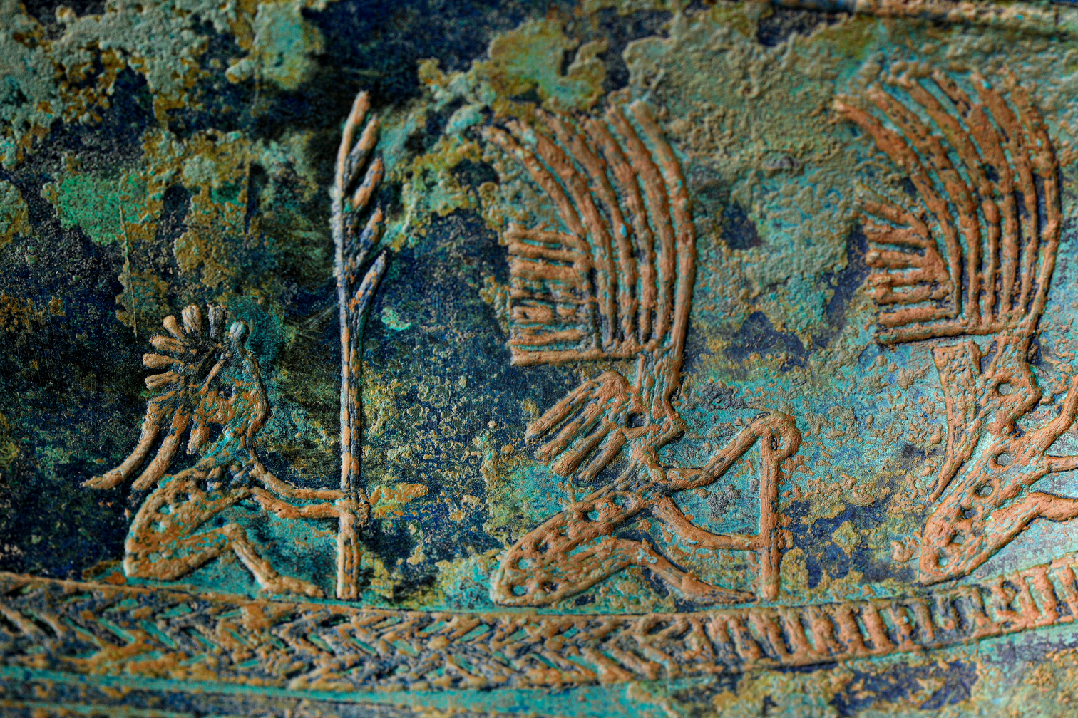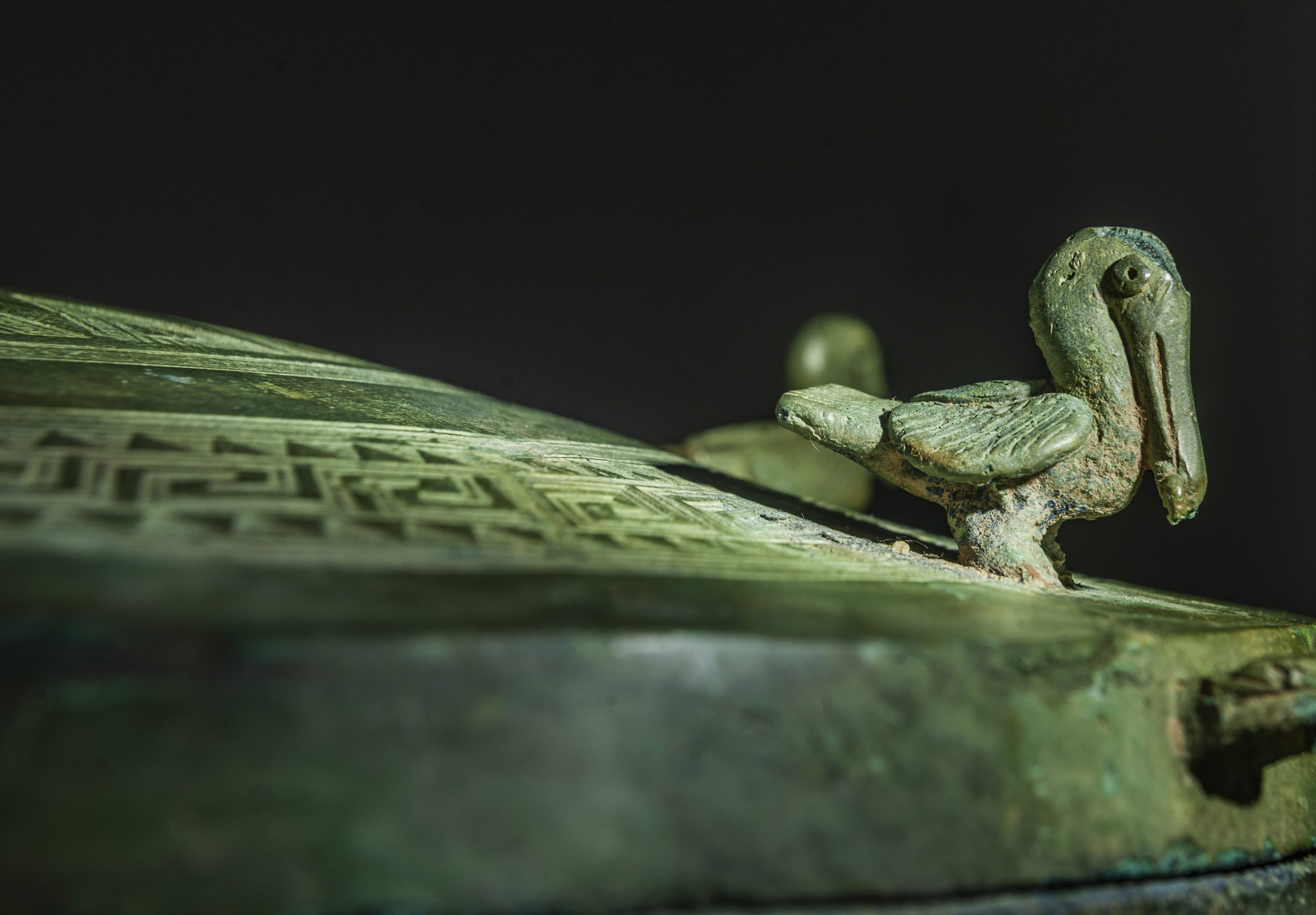 Flying birds are a common motif on Dong Son drums. Many patterns depict birds with long beaks, wide-spread wings, and long tails, possibly representing storks. Some birds have large heads, big beaks, and short tails. These may represent pelicans. These ancient people also decorated artworks with common animals, such as oxen with humps, and deer with antlers. Inside the deer’s bodies are dotted patterns that could symbolize sika deer. Other patterns depict long-tailed foxes. Sea creatures were also shown, including jiaolong (a sea dragon from Chinese mythology), and even realistically portrayed crocodiles, fish, horseshoe crabs, and sea turtles, etc.