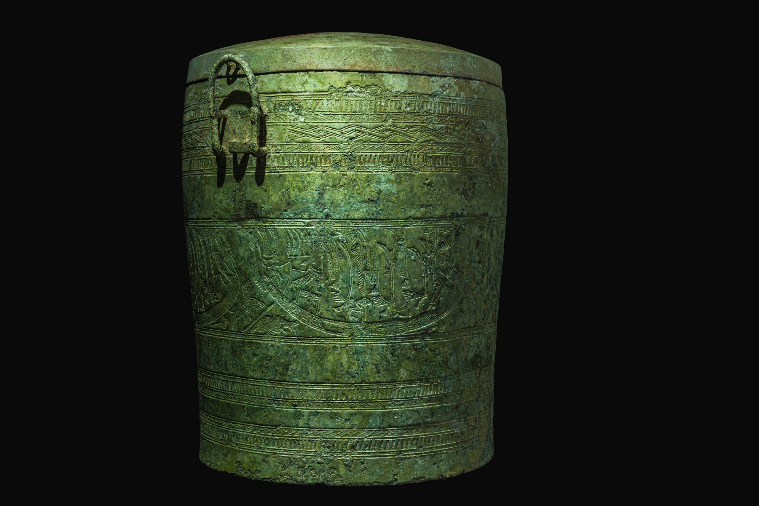 Skilled in creating raised and recessed patterns on drums and jars, even though they sculpted with a single material like bronze, these ancient artists were able to create the effect of light and dark hues in their designs.