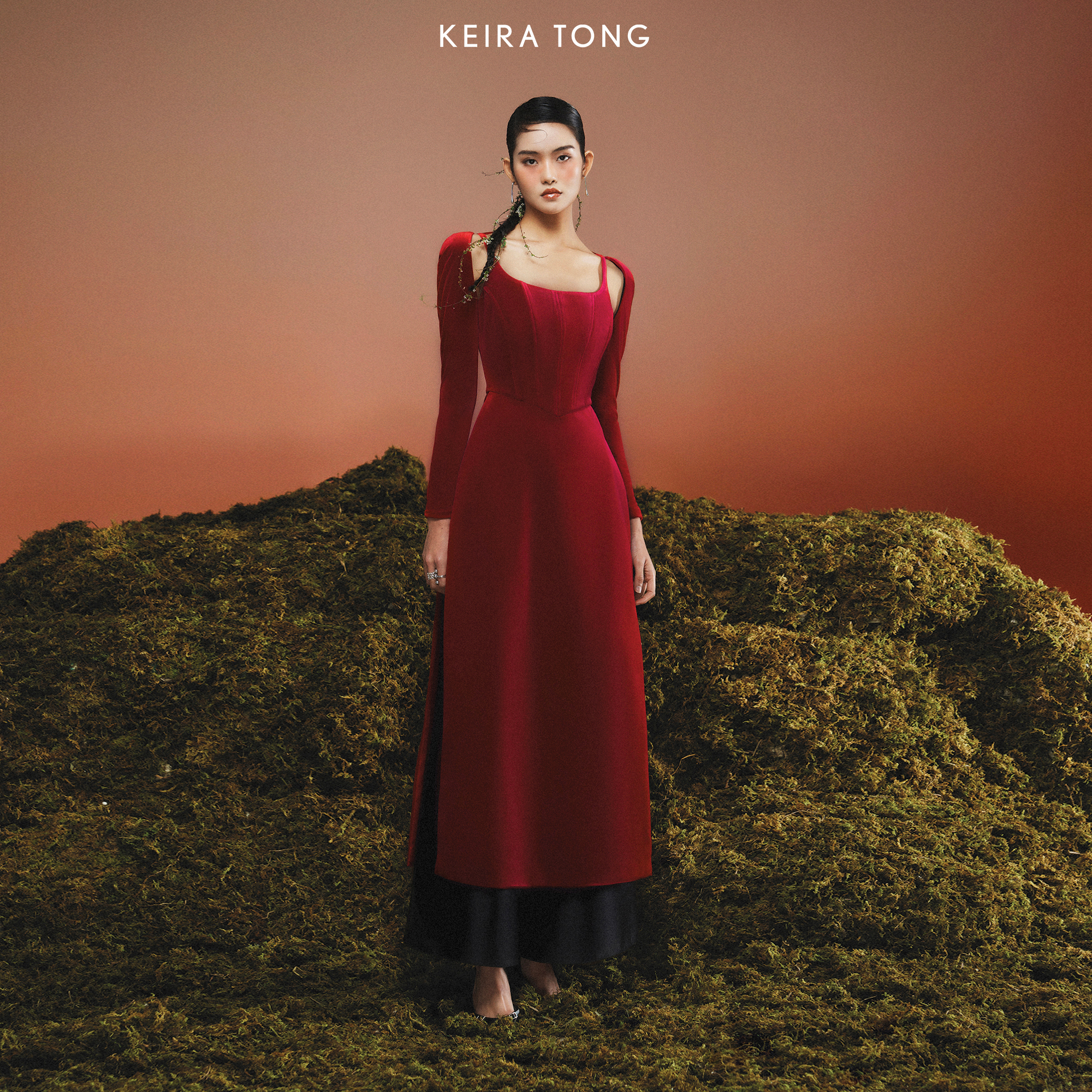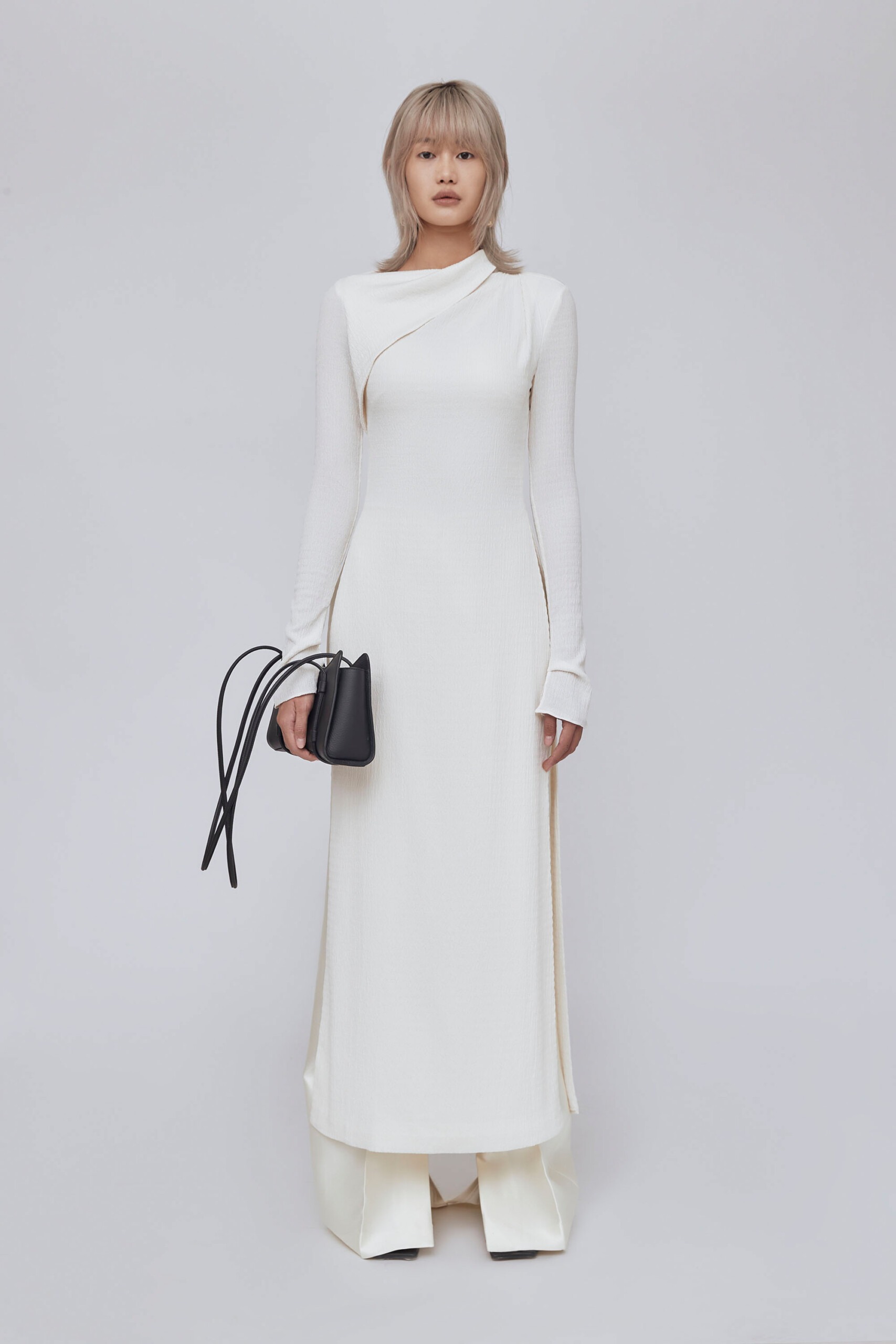 For those who favor innovation, the conversation no longer revolves solely around traditional shapes and materials. Gen Z women often say, “As the country becomes more modern, so does the ao dai.” Consequently, fashion houses offer an array of choices in designs, colors, fits and sizes every Tet holiday season. Girls will undoubtedly be drawn to minimalist, monochrome ao dai designs, featuring pleat details and seamless fabric cutting and joining techniques. To elegantly style this ao dai and create a modern fashion statement, consider pairing it with distinctive accessories like the Fendi First bag, powerful boots and a scarf from YSL’s latest collection. Top it off with Prada gloves and the highly sought-after sunglasses from Céline.