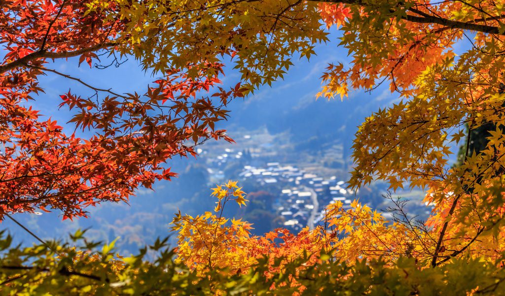 Autumn is also called “Momiji” in Japan, which refers to maple leaves turning bright red. Red maples transform the land of the rising sun into a fairy-land. Against a tapestry of bright leaves, temples, and pagodas appear even more outstanding. As autumn arrives, the road leading up Mount Houju, where Yamadera Temple in Yamagata prefecture is reached by climbing more than a thousand steps, is crowded with tourists. They come to admire the leaves and the roadside scenery of poetic yellow and red forests.