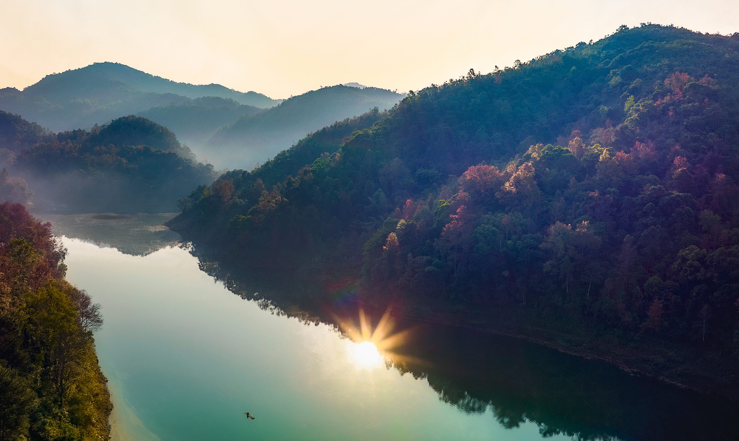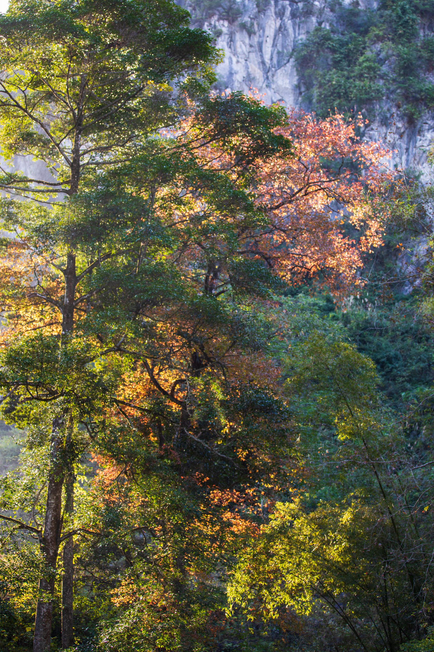 Ban Viet Lake is stunning in all seasons. In the spring, flowers and leaves sprout, eager to display their vibrant colors. In the summer, the flora is lush and radiant, basking in the sun. The most beautiful and poetic scenes, however, occur in late autumn and early winter, when the Formosan gum leaves change color from dark green to dark yellow, then red. The entire forest appears to have woken up. The red-leafed Formosan gum tree is a large tree that can grow to a height of 10 meters. This species grows wild in the mountains of Cao Bang, but is most abundant in the forest surrounding Ban Viet Lake. Because Formosan gum leaves are fragrant and edible, they are often used to make five-color sticky rice or served as a garnish. From above, the Formosan gum forest emerges as a breathtaking canvas recently finished by a skilled artist.